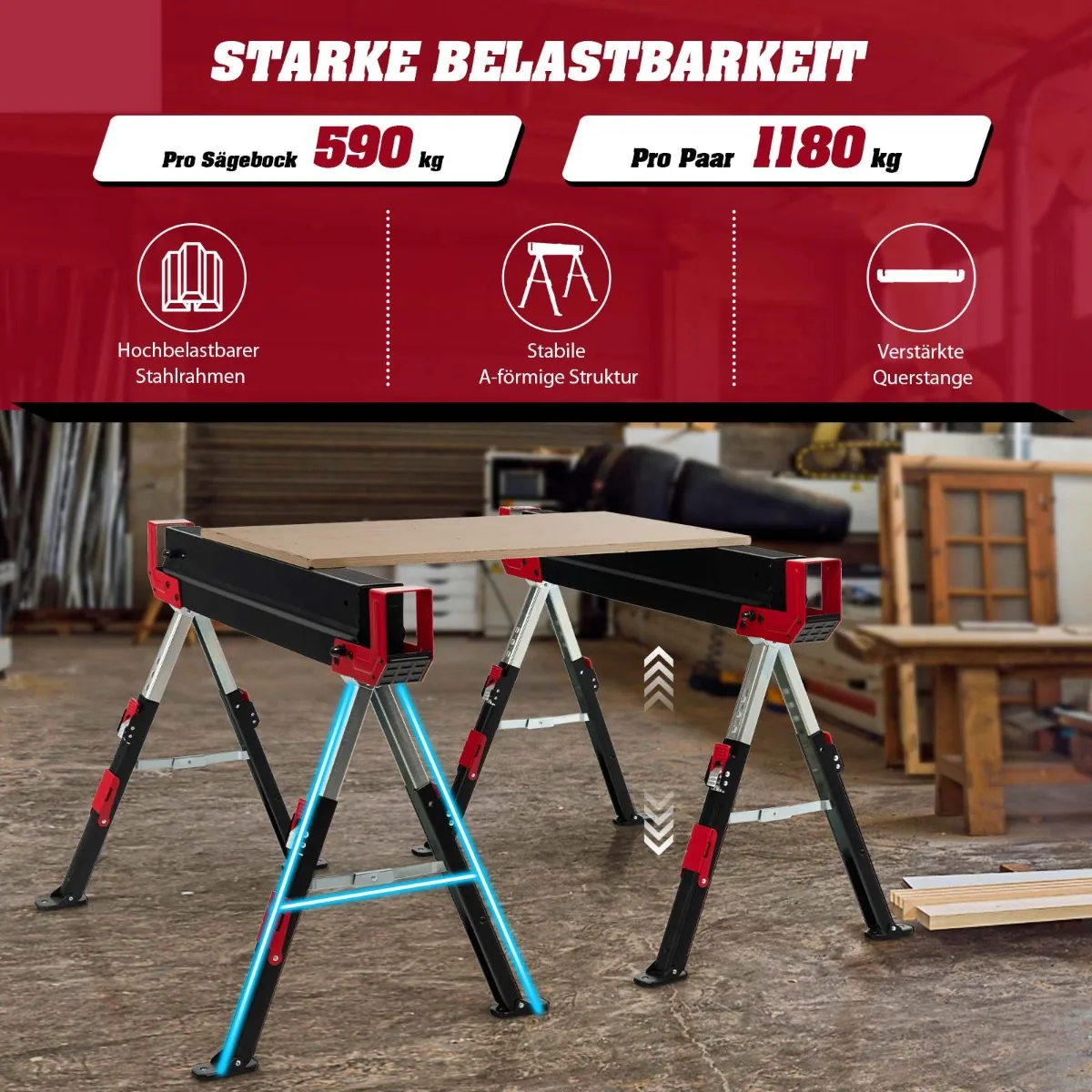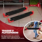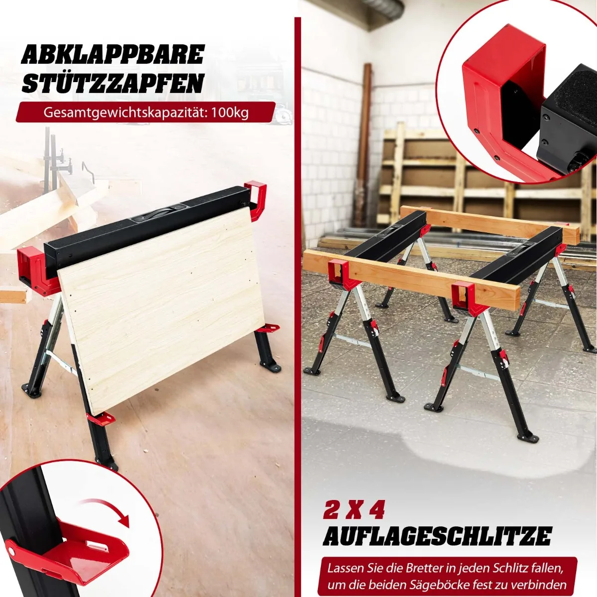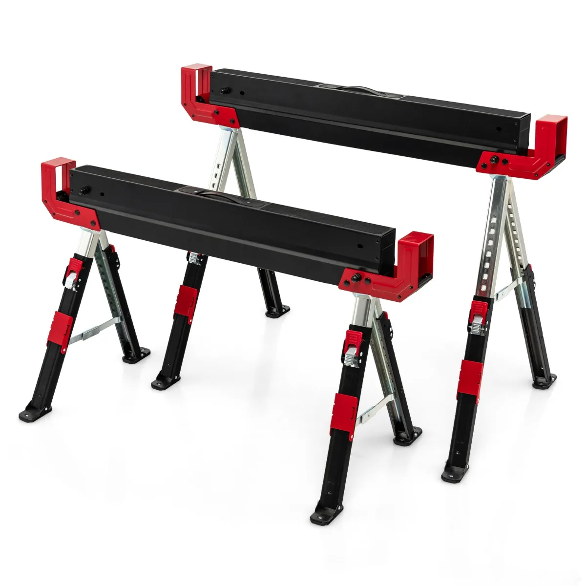 Rinkinys iš 2 statybinių stovų (pjovimo arkliukų) juodos ir raudonos spalvos skirtas saugiam ir patogiam medienos apdirbimui. Sulankstoma konstrukcija bei reguliuojamas aukštis leidžia pritaikyti stovus įvairioms darbo užduotims ir sutaupyti vietos saugojant.