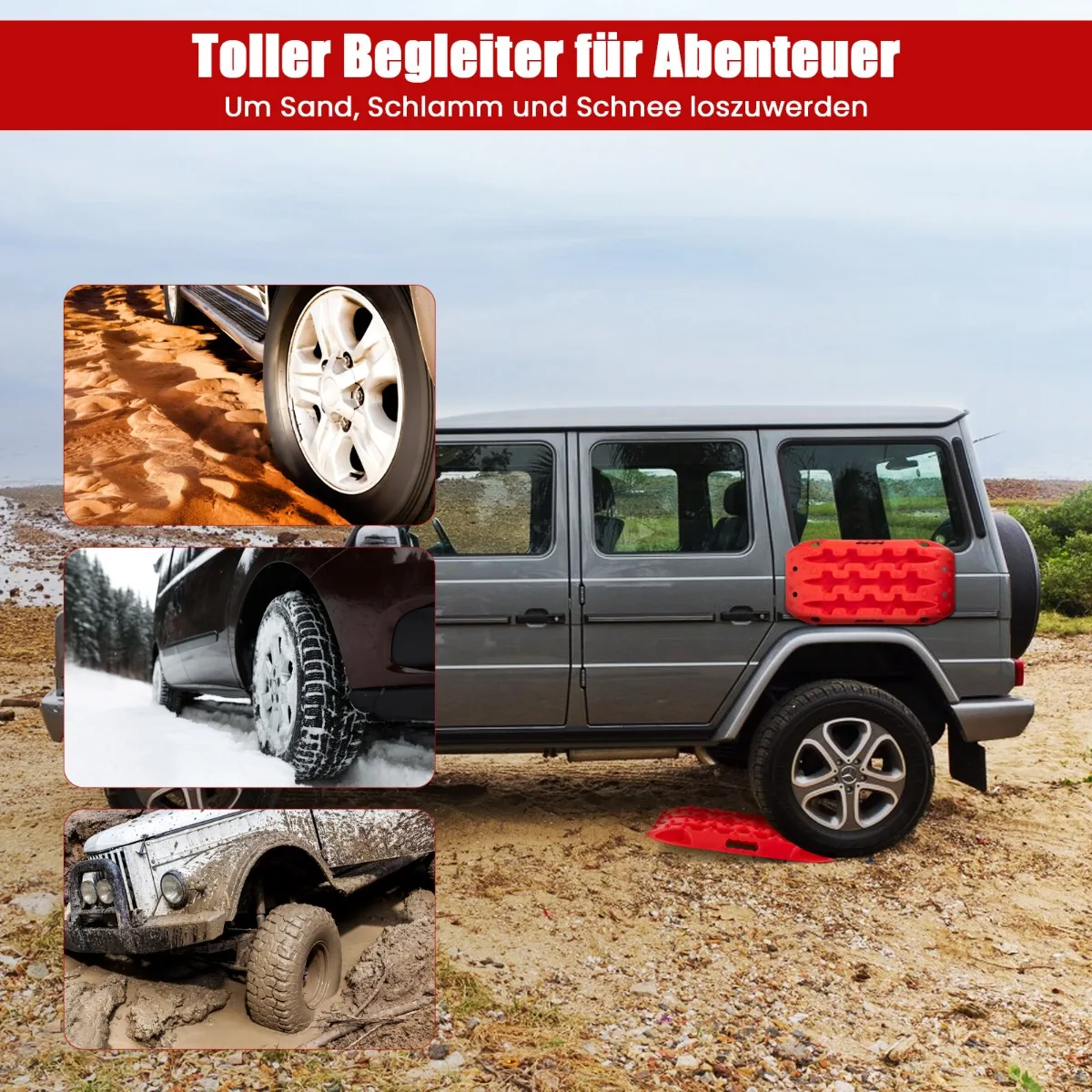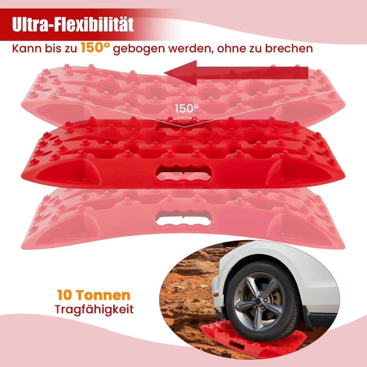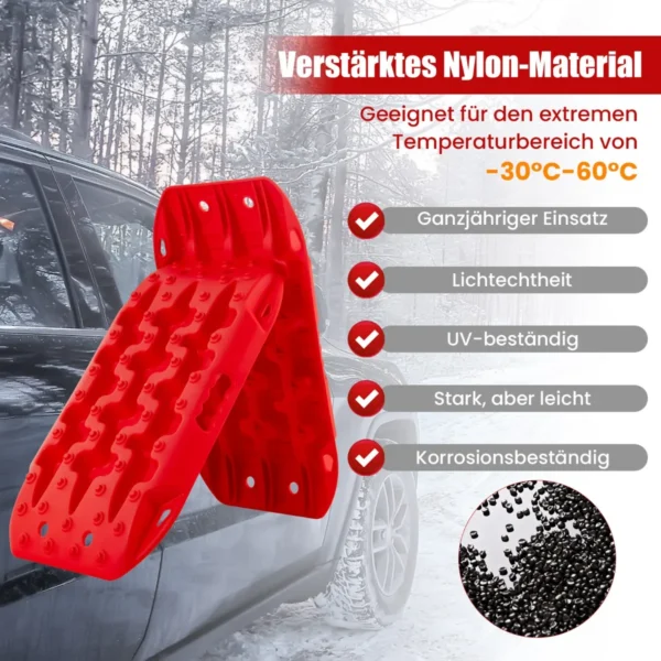 Rinkinys iš 2 sukibimo kilimėlių 58x31x6 cm, raudonos spalvos, skirtas bekelės transporto priemonių padangų traukai ir stabilizavimui. Šie patvarūs ir lengvi kilimėliai padeda išvengti padangų sukimosi ant smėlio, purvo ar sniego, lengvina įstrigusių automobilių ištraukimą įvairiomis oro sąlygomis.