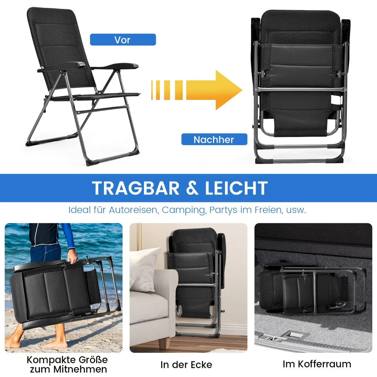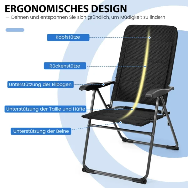 Rinkinys iš 2 sulankstomų kėdžių juodos spalvos – puikus sprendimas lauko erdvėms. Šios kėdės skirtos terasoms, balkonams, sodams bei baseinų zonoms, užtikrinant patogumą ir lengvą transportavimą. Sulankstomas dizainas leidžia greitai ir patogiai jas laikyti bei pernešti.
