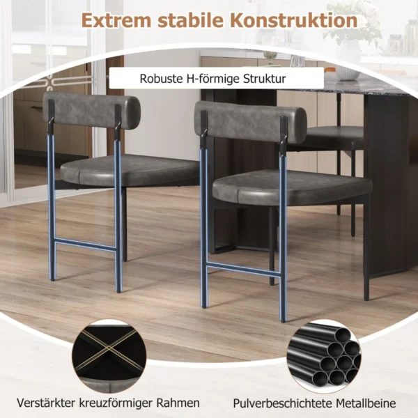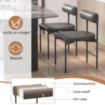 Rinkinys iš 2 valgomojo kėdžių, matmenimis 47,5 x 46 x 74 cm, yra praktiškas sprendimas jūsų virtuvės ar valgomojo erdvei. Tamsiai pilkos spalvos PVC dirbtinės odos apmušalai ir juodos metalo konstrukcijos užtikrina patvarumą bei lengvą priežiūrą. Šis komplektas puikiai tinka tiek namų, tiek komerciniam naudojimui.