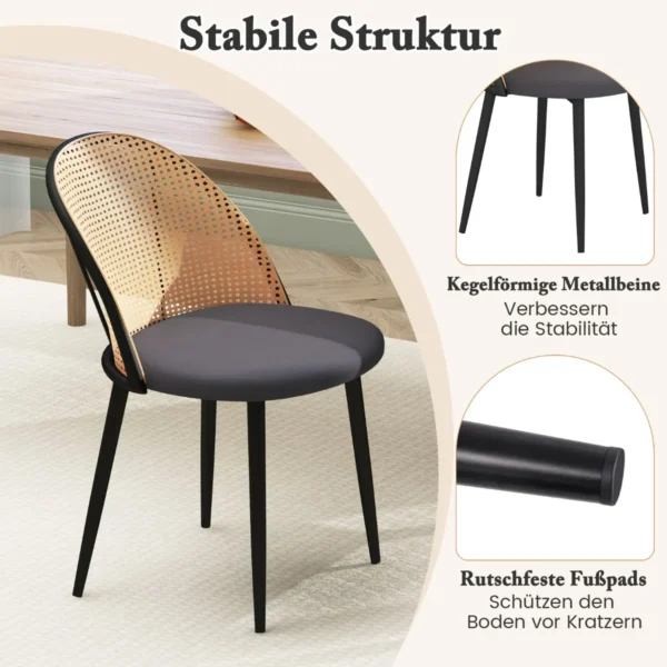 Rinkinys iš 2 valgomojo kėdžių su PE rotango atlošu ir metalinėmis kojomis. Kėdžių matmenys – 56,5x53x78 cm, jas galima naudoti tiek namų, tiek komercinėse erdvėse. Kėdės turi paminkštintas sėdimas vietas ir neslystančias pagalvėles, kurios apsaugo grindis.