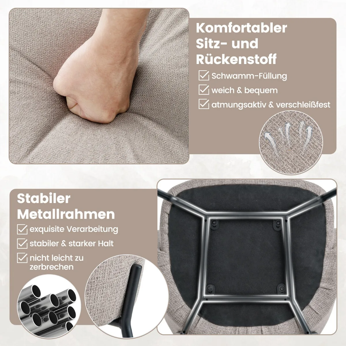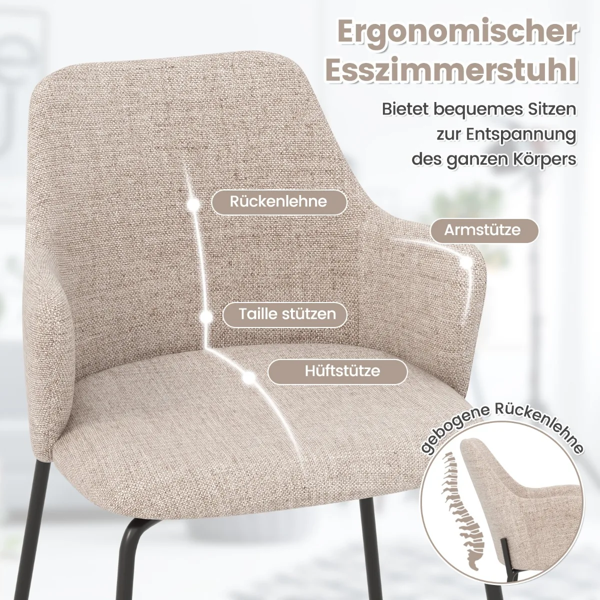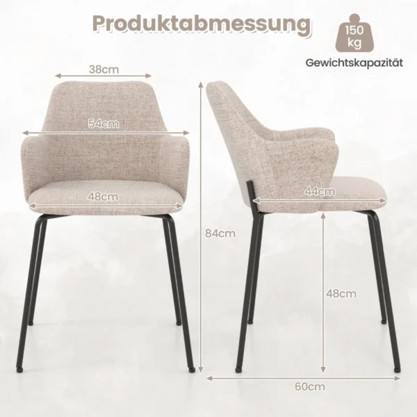 Rinkinys iš 2 valgomojo kėdžių 60x54x84 cm, smėlio ir juodos spalvos, sukurtas patogiam ir ergonomiškam sėdėjimui. Kėdės tinka valgomojo, svetainės ar miegamojo kambariams, pasižymi tvirtu metaliniu rėmu ir dėvėjimui atspariu audiniu.