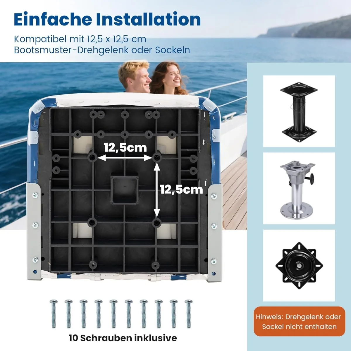 - Rinkinyje yra 10 varžtų, skirtų sėdynių montavimui prie 12,5 x 12,5 cm pjedestalų ar pasukamų pagrindų (pagrindai nepridedami).