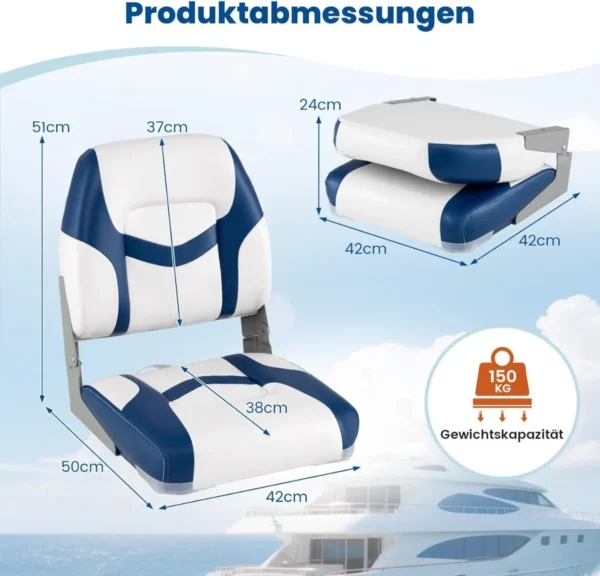 - Komplektą sudaro dvi valties sėdynės, matmenys 42 x 49 x 51 cm (Ilgis x Plotis x Aukštis).