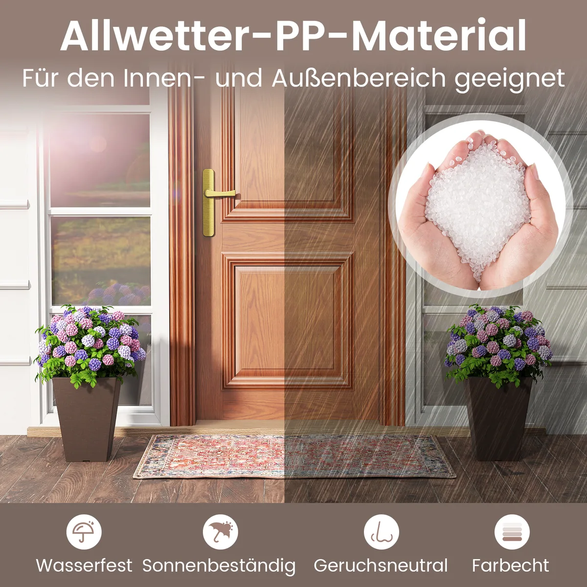 - Pagaminti iš patvarios PP medžiagos, atsparios saulei ir vandeniui, tinkami naudoti viduje ir lauke.