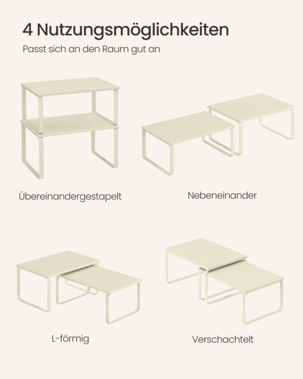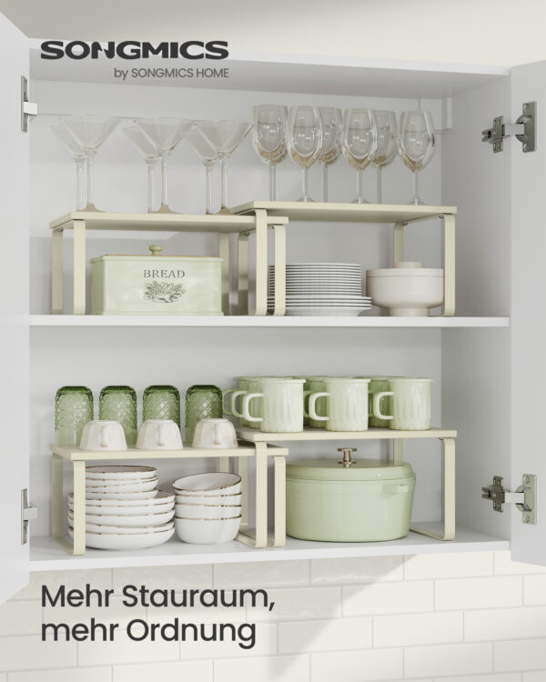 Šis rinkinys iš 2 virtuvės lentynų, kreminės baltos spalvos, yra puikus sprendimas jūsų virtuvės organizavimui. Jų elegantiška spalva suteikia šviesos ir stiliaus jūsų interjerui.