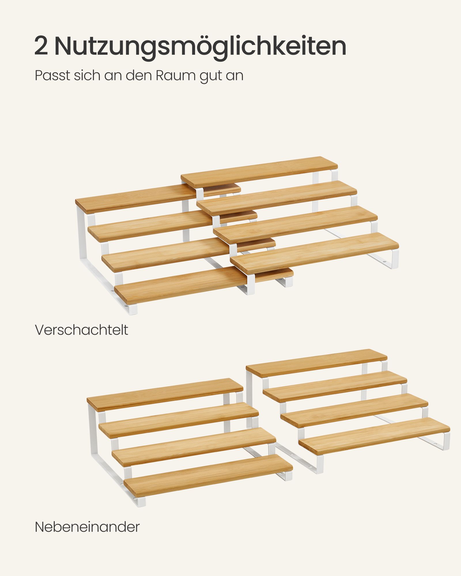 Pagamintos iš aukštos kokybės medienos ir plieno, šios lentynos yra tvirtos ir ilgaamžės. Didelės lentynos matmenys yra 31,9 x 32 x 14,8 cm, o mažos lentynos – 31 x 32 x 12,8 cm. Bendras svoris siekia 2,2 kg.