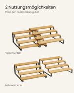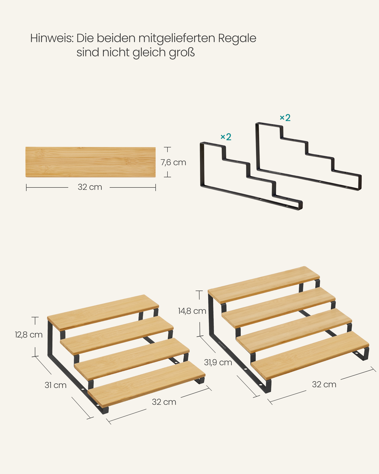 Pagamintos iš aukštos kokybės medienos ir plieno, šios lentynos yra tvirtos ir ilgaamžės. Didelės lentynos matmenys yra 31,9 x 32 x 14,8 cm, o mažos lentynos – 31 x 32 x 12,8 cm. Bendras svoris siekia 2,2 kg.