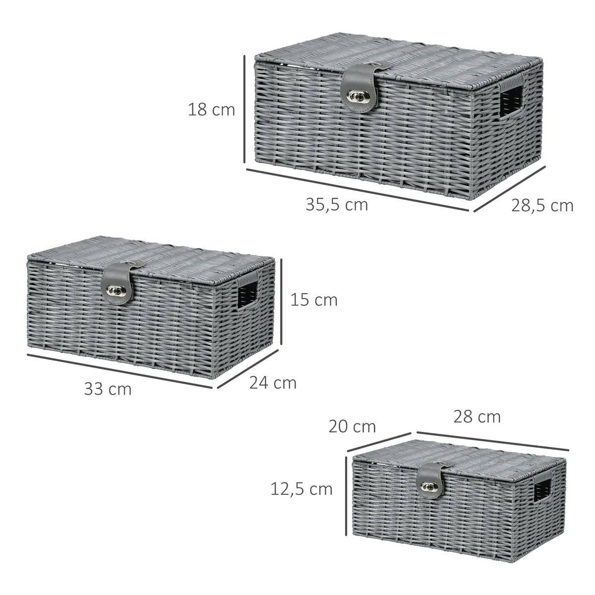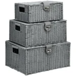 Mūsų 3 skirtingų dydžių krepšeliai iš HOMCOM siūlo įvairias laikymo galimybes ir pakankamai vietos daiktams tvarkyti. Rankų darbo meistriškumas suteikia kambario dekorui natūralaus grožio ir stiliaus, todėl sandėliavimas taip pat atitinka stilių. Puikiausias PP plastikas su išskirtiniu apdirbimu stiprina stiprumą. Sukurta su dangteliais ir sagtimis, todėl galite saugiai laikyti savo daiktus viduje. Be to, dėl lengvo dizaino lengva transportuoti. Su šiais stilingais krepšeliais galite sukurti tvarką bet kurioje patalpoje.