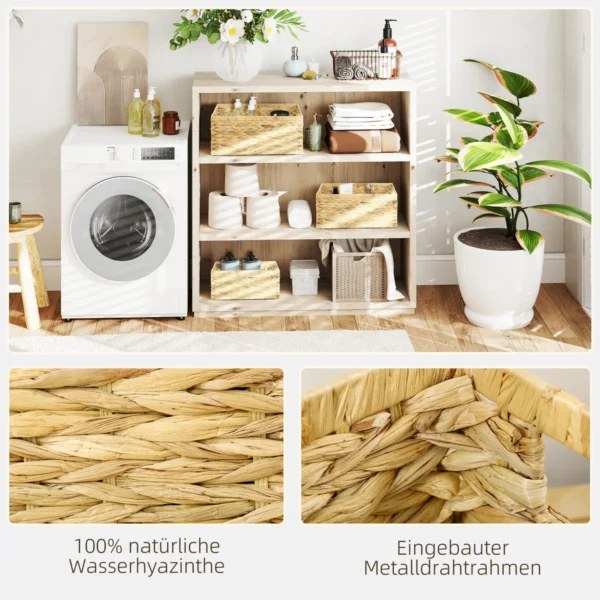 Patirkite praktinį HOMCOM laikymo krepšelių žavesį. Šį rinkinį sudaro trys skirtingų dydžių krepšeliai, kuriuose yra daug organizacinės erdvės. Rankomis austi iš natūralaus vandens hiacinto ir su tvirtu metaliniu rėmu šie laikymo krepšeliai suderina komfortą ir kaimišką eleganciją. Puikiai tinka jūsų namams ar biurui, stilingai sutvarkyti bet kurį kambarį.