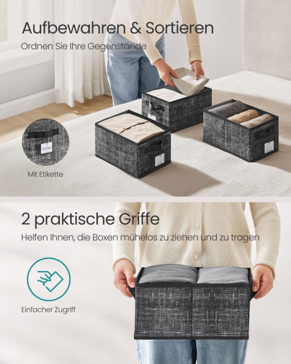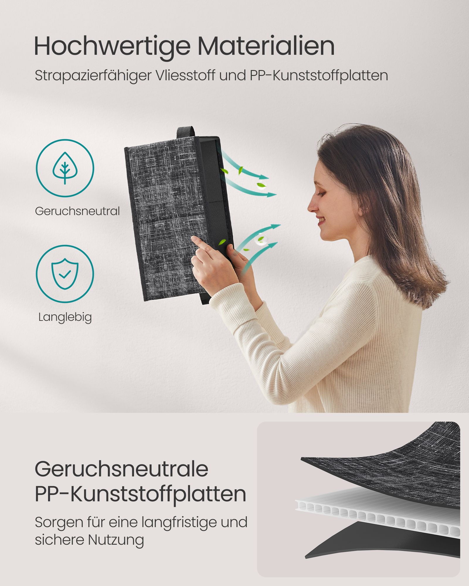 Šios dėžės yra pagamintos iš aukštos kokybės medžiagų, užtikrinančių ilgaamžiškumą ir patikimumą. Neaustinis audinys suteikia dėžėms elegantišką išvaizdą, o PP plastikas užtikrina tvirtumą ir atsparumą kasdieniam naudojimui.