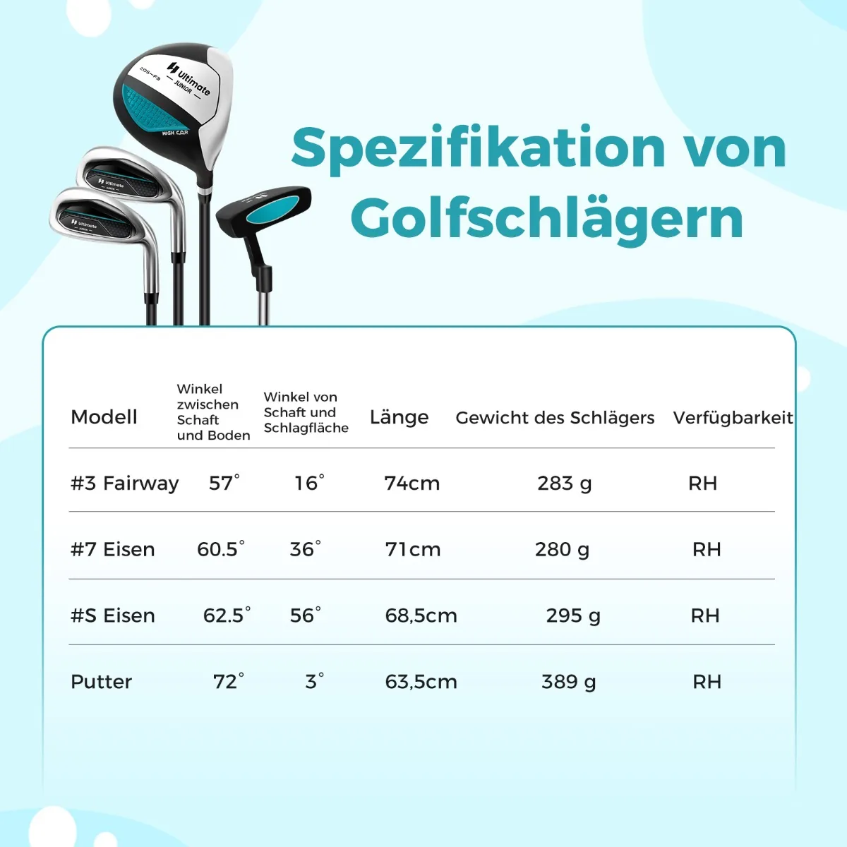 - S-lygintuvas: 62,5° (gulimas), 56° (palėpė), 68,5 cm (ilgis), 295 g (klubo svoris)