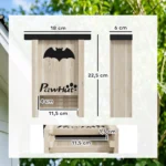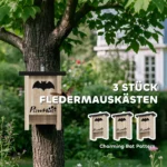 Šis trijų eglės medinių namelių rinkinys, dekoruotas šikšnosparnio dizainu, dėl vandeniui atsparios dangos siūlo patogų atsitraukimą šikšnosparniams. Siaura, grioveliais dekoruota tūpimo platforma leidžia gyvūnams lengvai įskristi ir saugo nuo paukščių – idealiai tinka fermose, soduose ir kitoje aplinkoje.