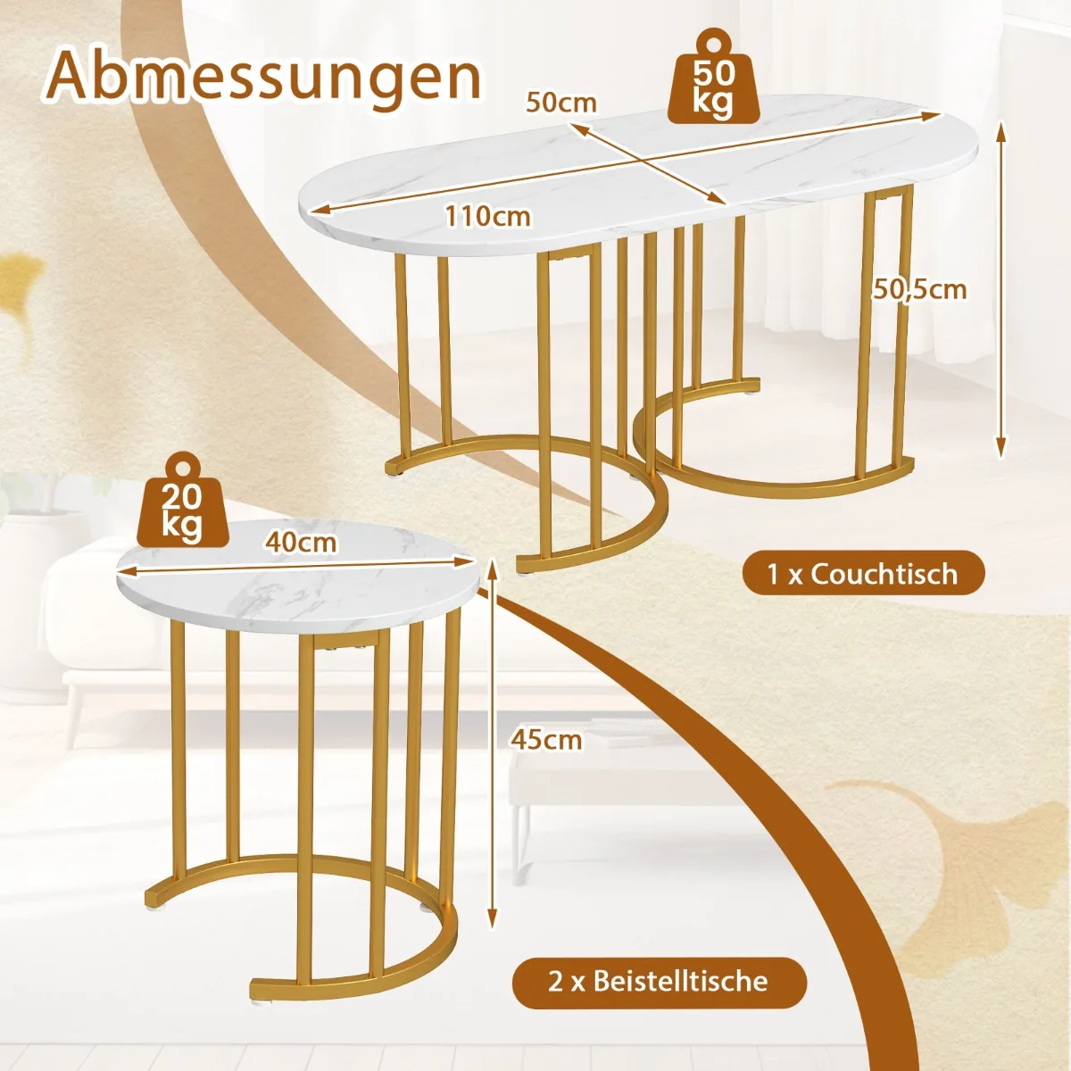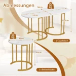 Rinkinys iš 3 kavos staliukų baltos ir auksinės spalvos puikiai tinka svetainės ar biuro erdvėms. Šie kavos staliukai su lizdų konstrukcija leidžia efektyviai sutaupyti vietos, o derinys iš dirbtinio marmuro stalviršių ir metalinių rėmų užtikrina funkcionalumą bei patvarumą.