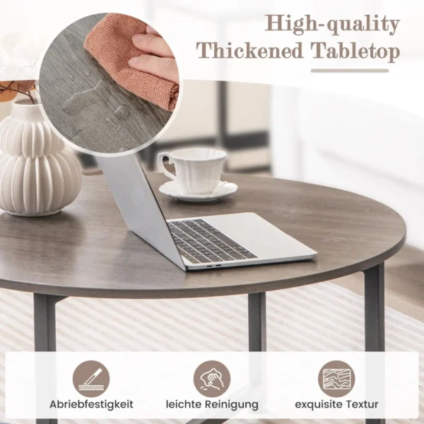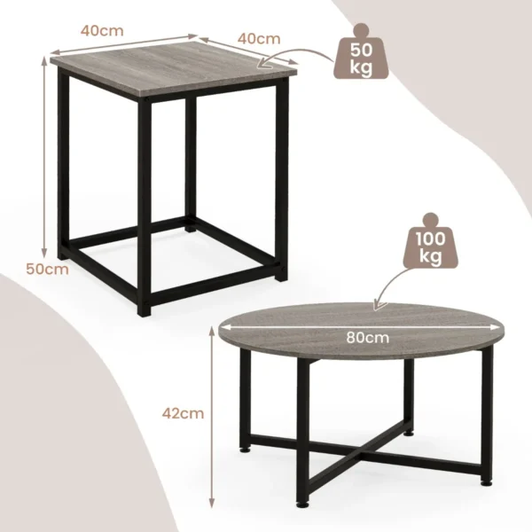 Rinkinys iš 3 kavos staliukų juodos ir pilkos spalvos puikiai papildo įvairaus stiliaus svetaines. Šie kavos staliukai pasižymi tvirta metaline konstrukcija ir patvariu stalviršiu, užtikrinančiu funkcionalumą bei patogų daiktų laikymą.