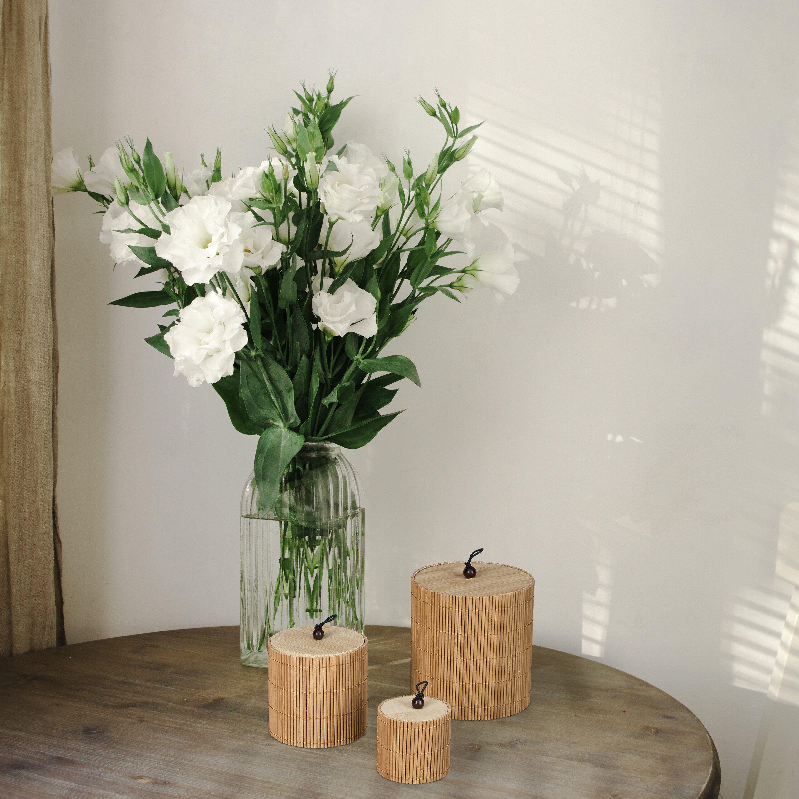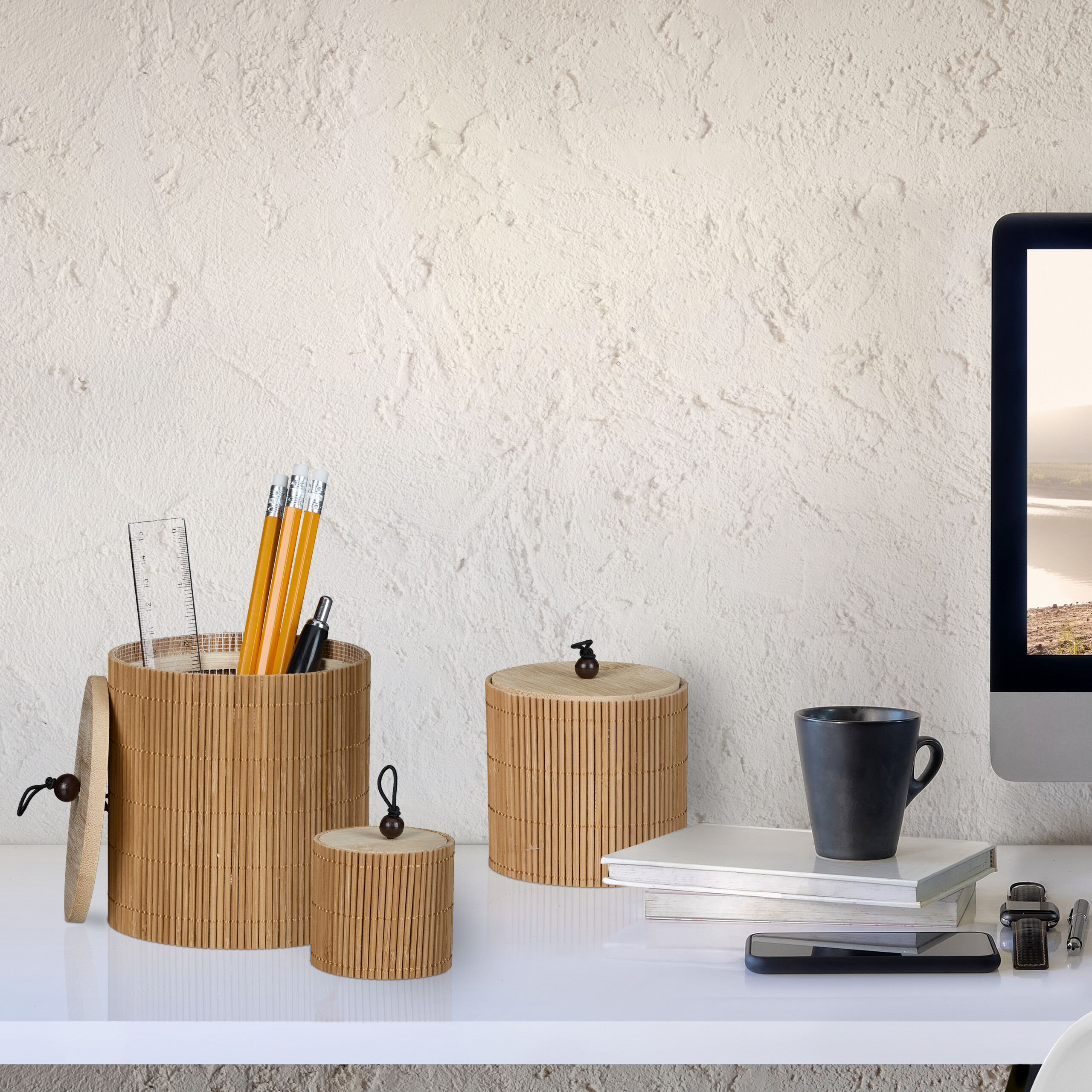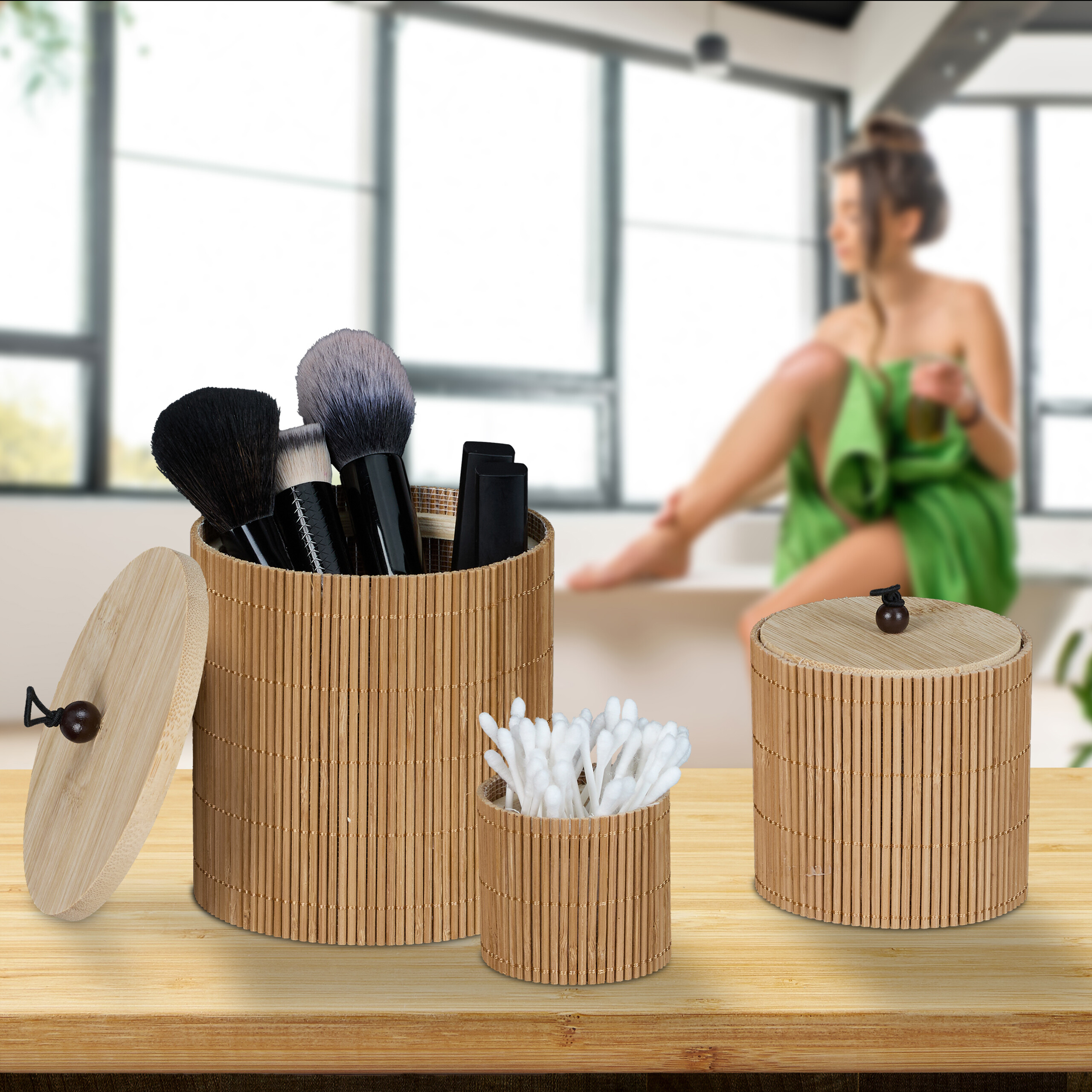 Įneškite tvarkos ir stiliaus į savo namus su šiuo natūralaus bambuko krepšelių rinkiniu. Šie elegantiški ir funkcionalūs organizatoriai su dangteliais yra puikus sprendimas įvairiems daiktams laikyti. Nesvarbu, ar norite sutvarkyti kosmetiką vonios kambaryje, laikyti šepetėlius ant tualetinio staliuko, ar susidėti indus svetainėje, šis rinkinys puikiai tiks bet kuriai erdvei.