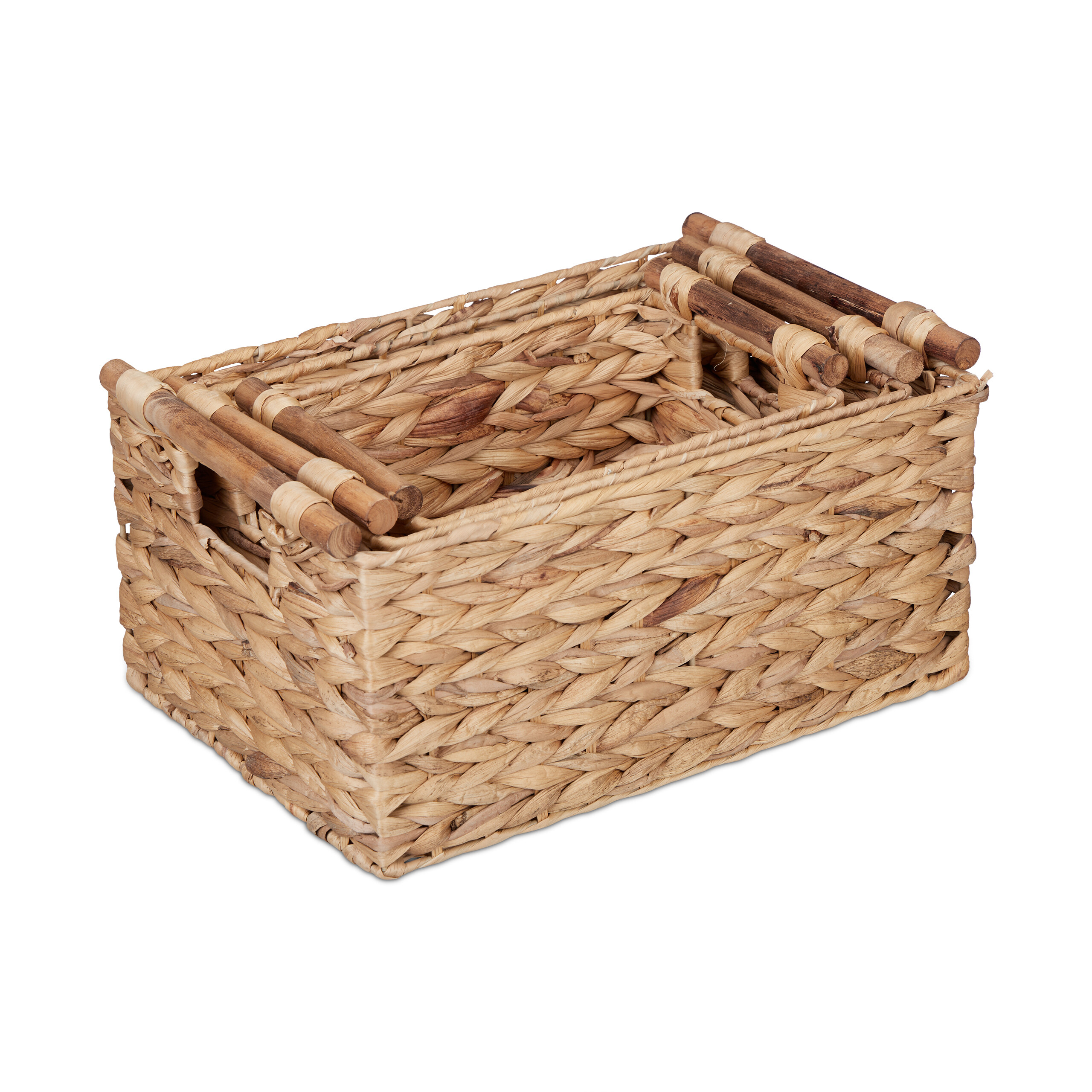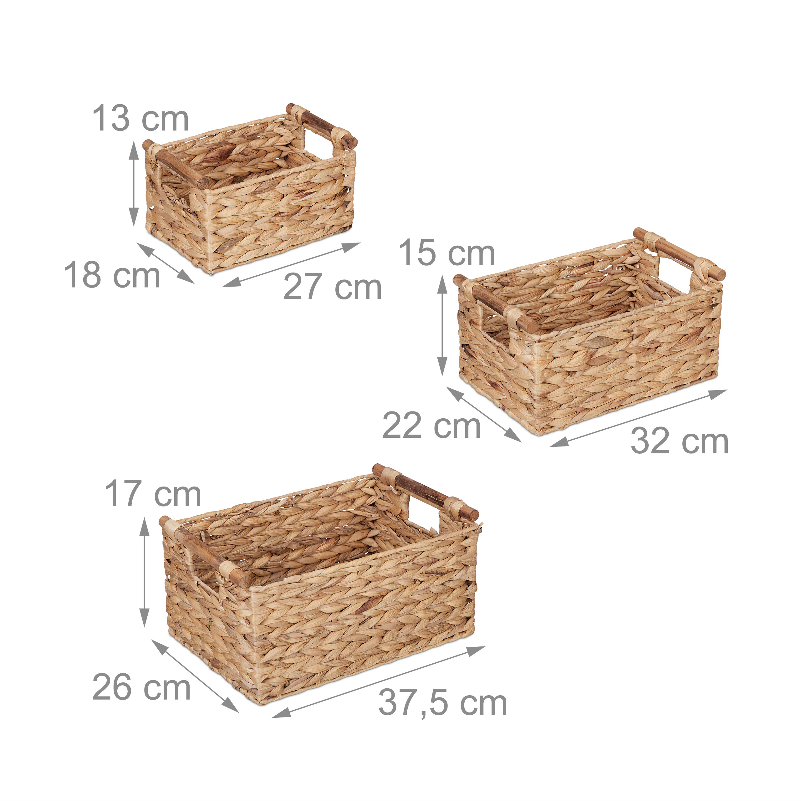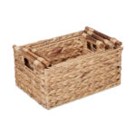 Krepšeliai pagaminti iš natūralaus vandens hiacinto, kuris žavi savo dekoratyviu, pintu dizainu. Kiekvienas krepšelis yra unikalus ir suteikia jūsų namams natūralios estetikos. Dėl trijų skirtingų dydžių, šie krepšeliai leidžia tvarkingai susidėti visas kasdienes smulkmenas, užtikrinant, kad jūsų namai visada atrodytų tvarkingai ir stilingai.