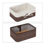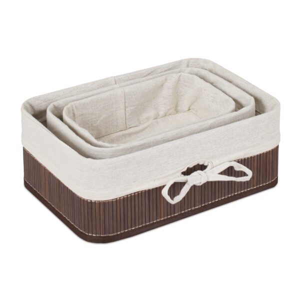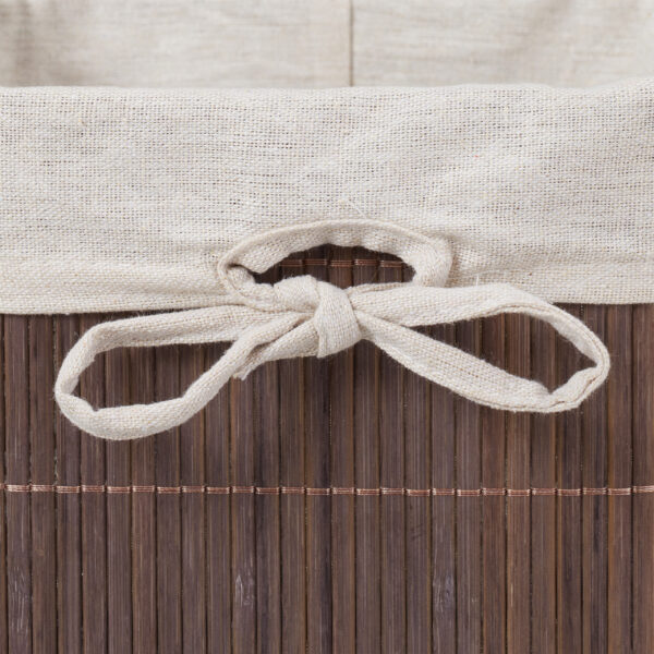 Krepšeliai pagaminti iš bambuko ir audinio, kurie suteikia jiems natūralų ir šiuolaikišką išvaizdą. Tamsiai rudos ir baltos spalvos derinys puikiai dera su įvairiais interjero stiliais, todėl krepšeliai tampa ne tik funkcionaliu, bet ir dekoratyviniu elementu bet kuriame kambaryje.