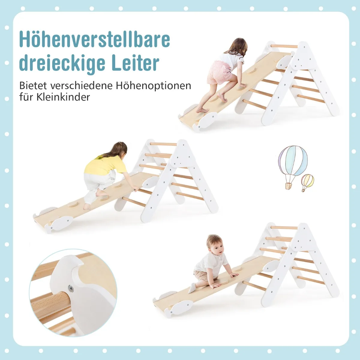 Rinkinys iš 3 laipiojimo žaislų šviesiai rudos ir baltos spalvos skirtas vaikų fiziniam lavinimui ir žaidimams. Medinis laipiojimo trikampis, laipiojimo arka bei dvipusė rampa suteikia įvairiapuses pramogas, lavina pusiausvyrą ir motoriką. Komplektas tinka vaikams nuo 1 metų ir gali būti naudojamas atskirai arba kartu.