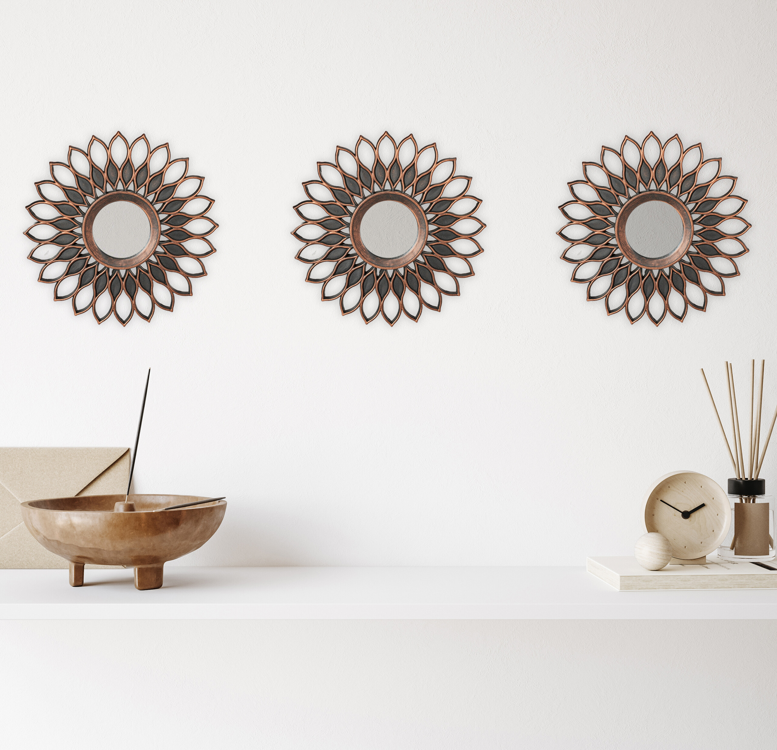 - Lankstus išdėstymas: Galite juos kabinti atskirai ant skirtingų sienų arba sukurti įspūdingą kompoziciją, kabindami visus tris veidrodžius kartu.
