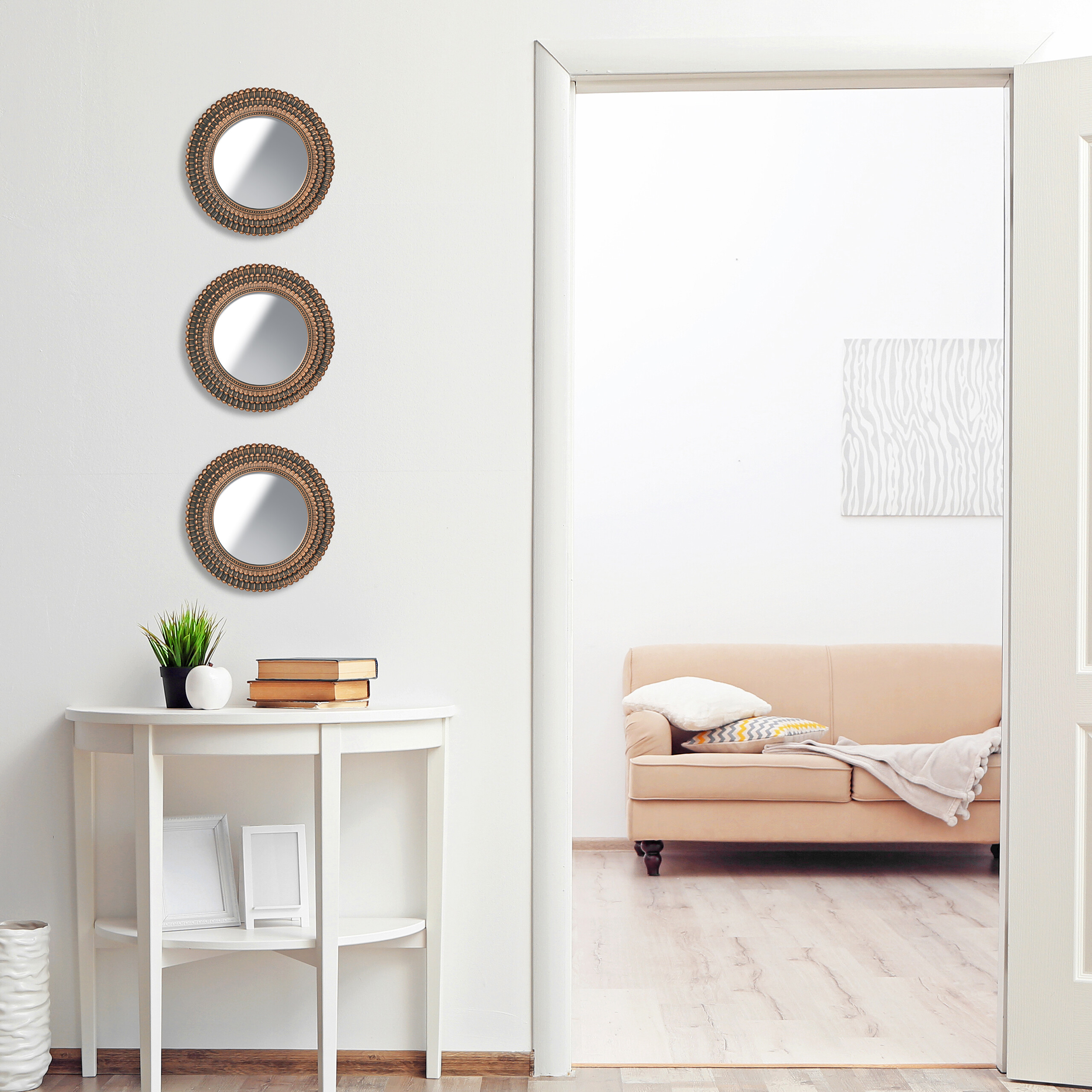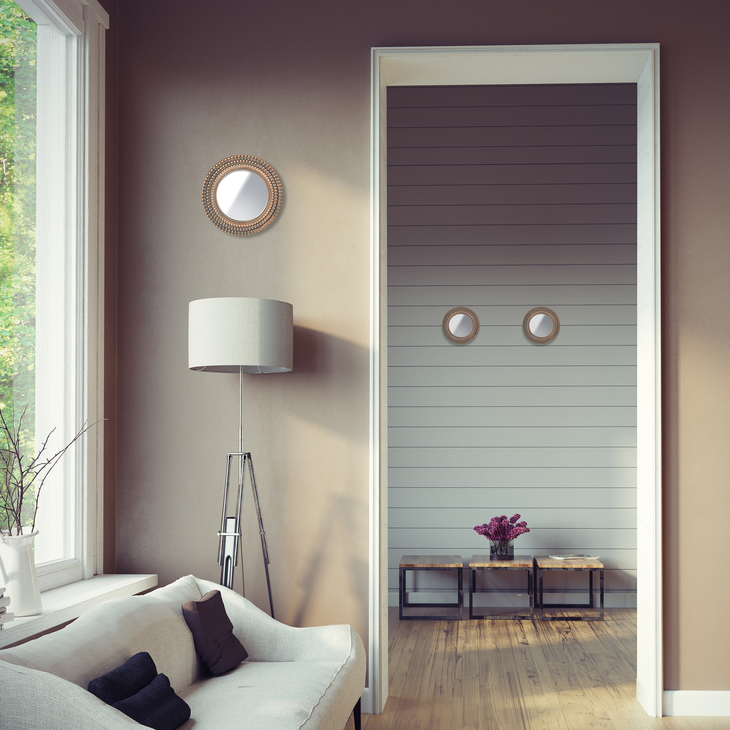 Šis veidrodžių rinkinys ne tik atspindi šviesą, bet ir vizualiai padidina erdvę, suteikdamas jai daugiau šviesos ir gyvybės. Tai puikus pasirinkimas tiek gyvenamiesiems kambariams, tiek miegamiesiems ar prieškambariams.