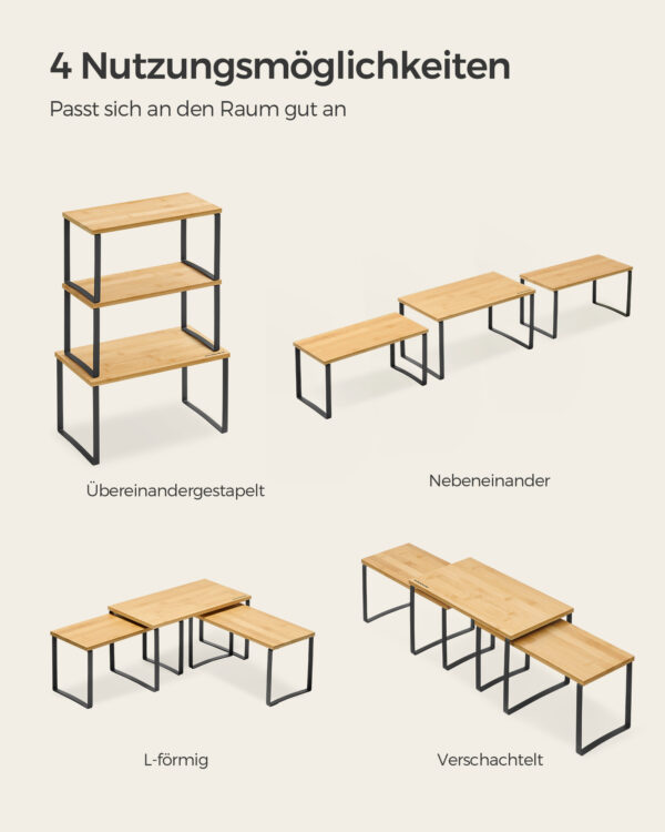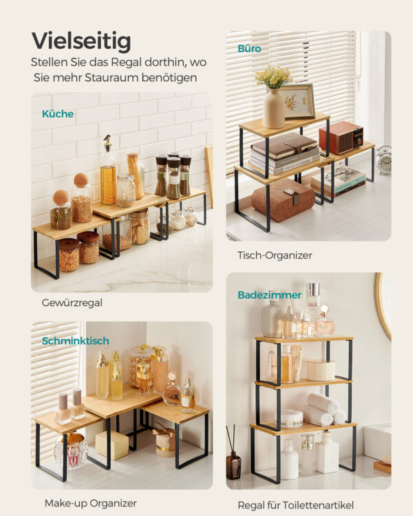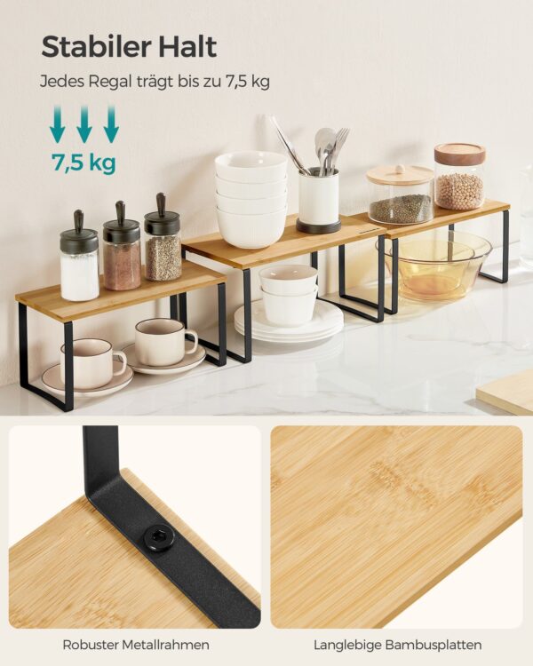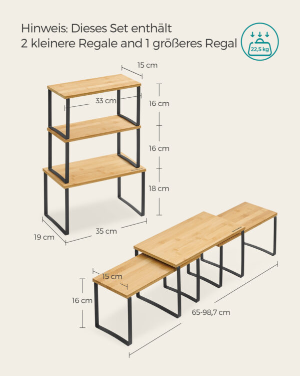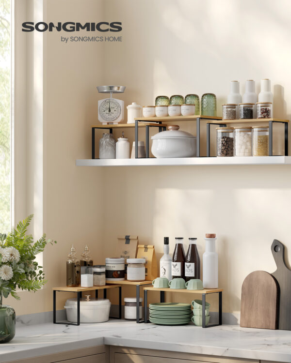 Šios lentynos ne tik suteiks jūsų virtuvei tvarkos, bet ir taps stilingu akcentu. Pagamintos iš aukštos kokybės metalo ir bambuko, jos užtikrina ilgaamžiškumą ir patikimumą. Nesvarbu, ar norite laikyti prieskonius, ar kitus virtuvės reikmenis, šis rinkinys yra puikus pasirinkimas jūsų namams.