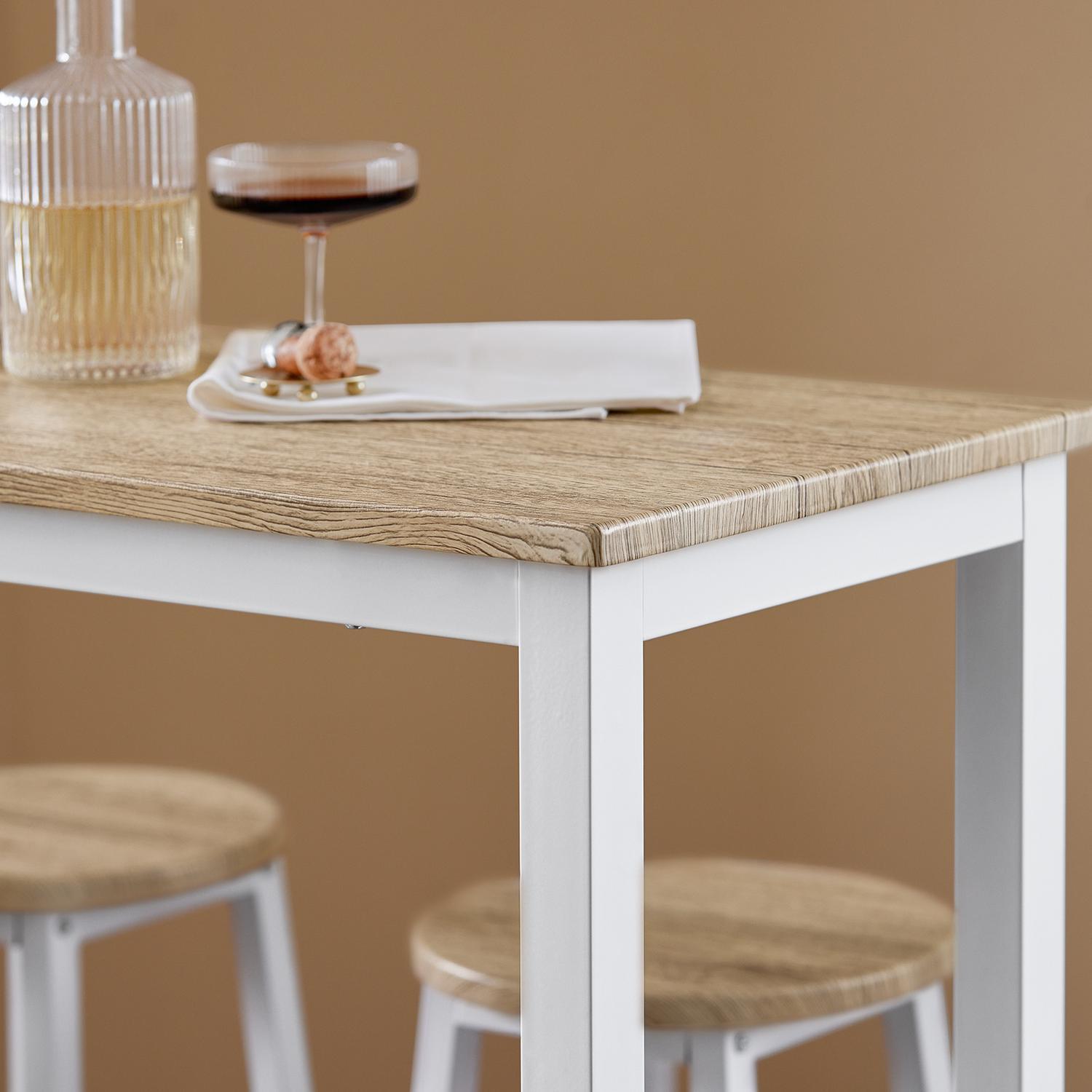 Šis paprastas ir tvirtas valgomojo komplektas puikiai tinka jūsų pusryčių kampeliui ar mažesnei valgomojo erdvei. Stalas yra itin stabilus dėl metalinio pagrindo, o jo elegantiškas ir paprastas dizainas leidžia jį naudoti restoranuose, kavinėse ar biurų susitikimų kambariuose.