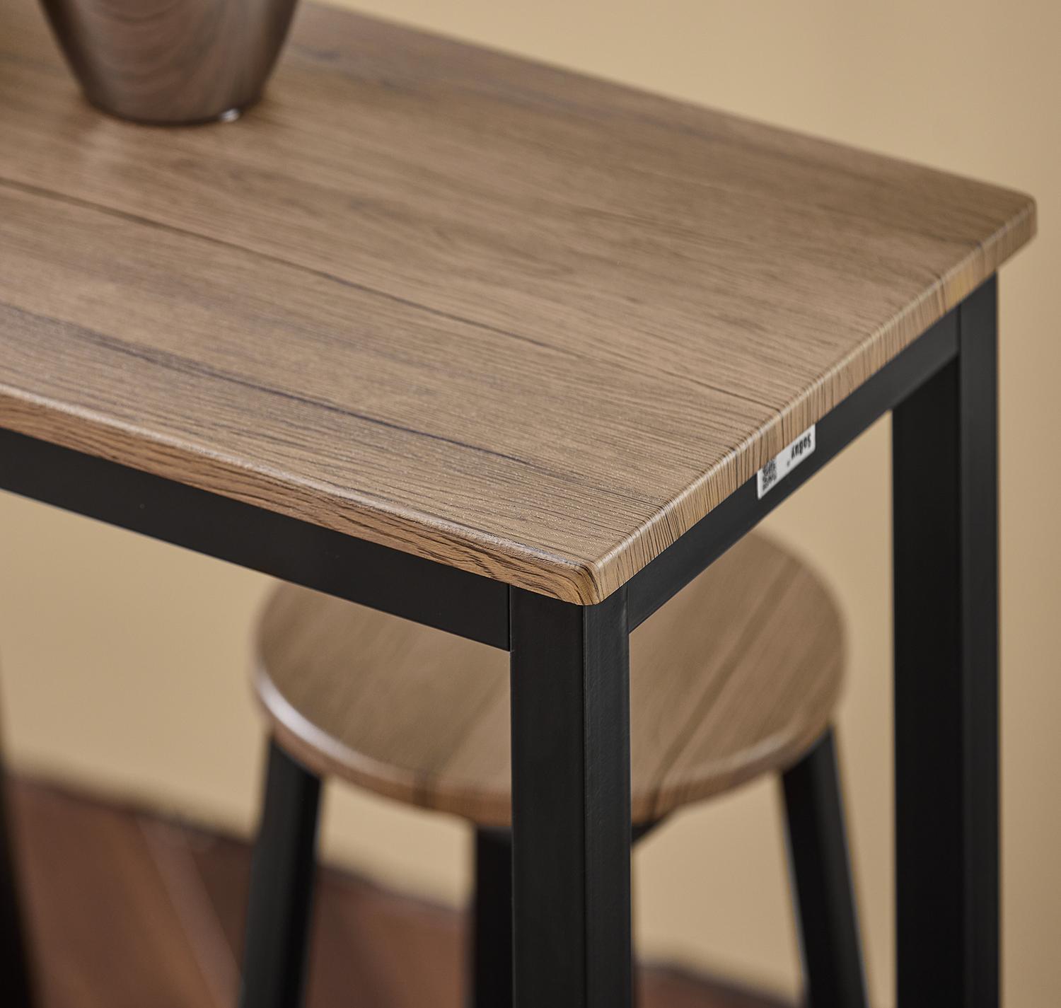 Rinkinys pagamintas iš aukštos kokybės medžio drožlių ir pluošto plokštės, padengtos PVC folija, bei plieno, padengto epoksidine milteline danga. Stalo matmenys: ilgis 120 cm, plotis 40 cm, aukštis 100 cm, testuotas iki 45 kg apkrovos. Kėdžių sėdimosios dalies aukštis yra 65 cm, sėdimosios dalies gylis 30 cm, testuotos iki 150 kg apkrovos. Kėdės turi pakojus, kurie suteikia patogią atramą kojoms.
