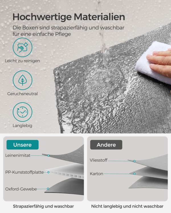 Šios dėžės yra pagamintos iš aukštos kokybės medžiagų, užtikrinančių ilgaamžiškumą ir patikimumą. Lino imitacija ir Oksfordo audinys suteikia dėžėms prabangos pojūtį, o PP plastikas užtikrina tvirtumą ir atsparumą kasdieniam naudojimui.