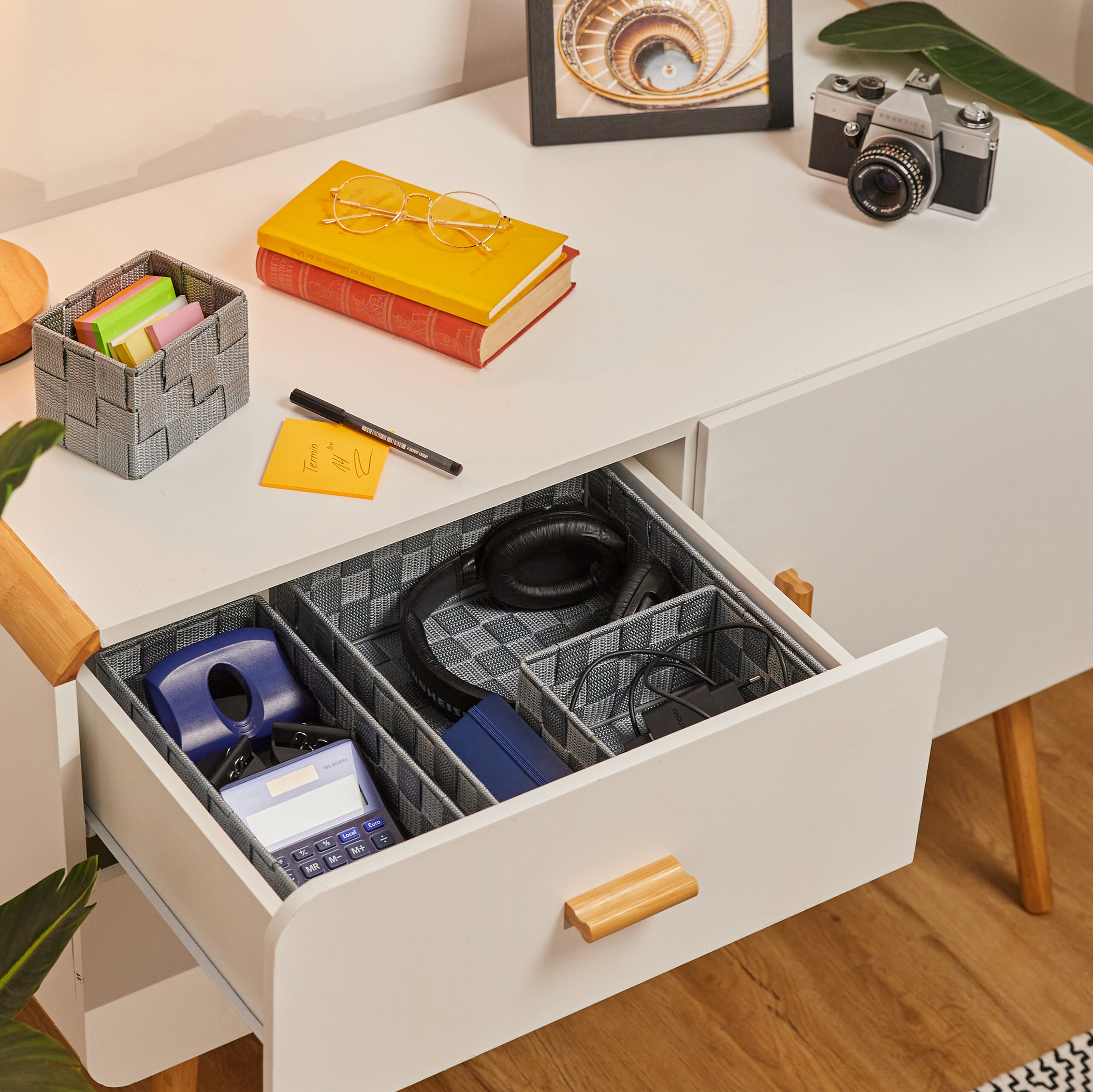 - Darbo kambarys: Puikiai tinka kaip stalčių tvarkyklės, padedančios organizuoti rašomojo stalo reikmenis ir išlaikyti darbo vietą švarią.