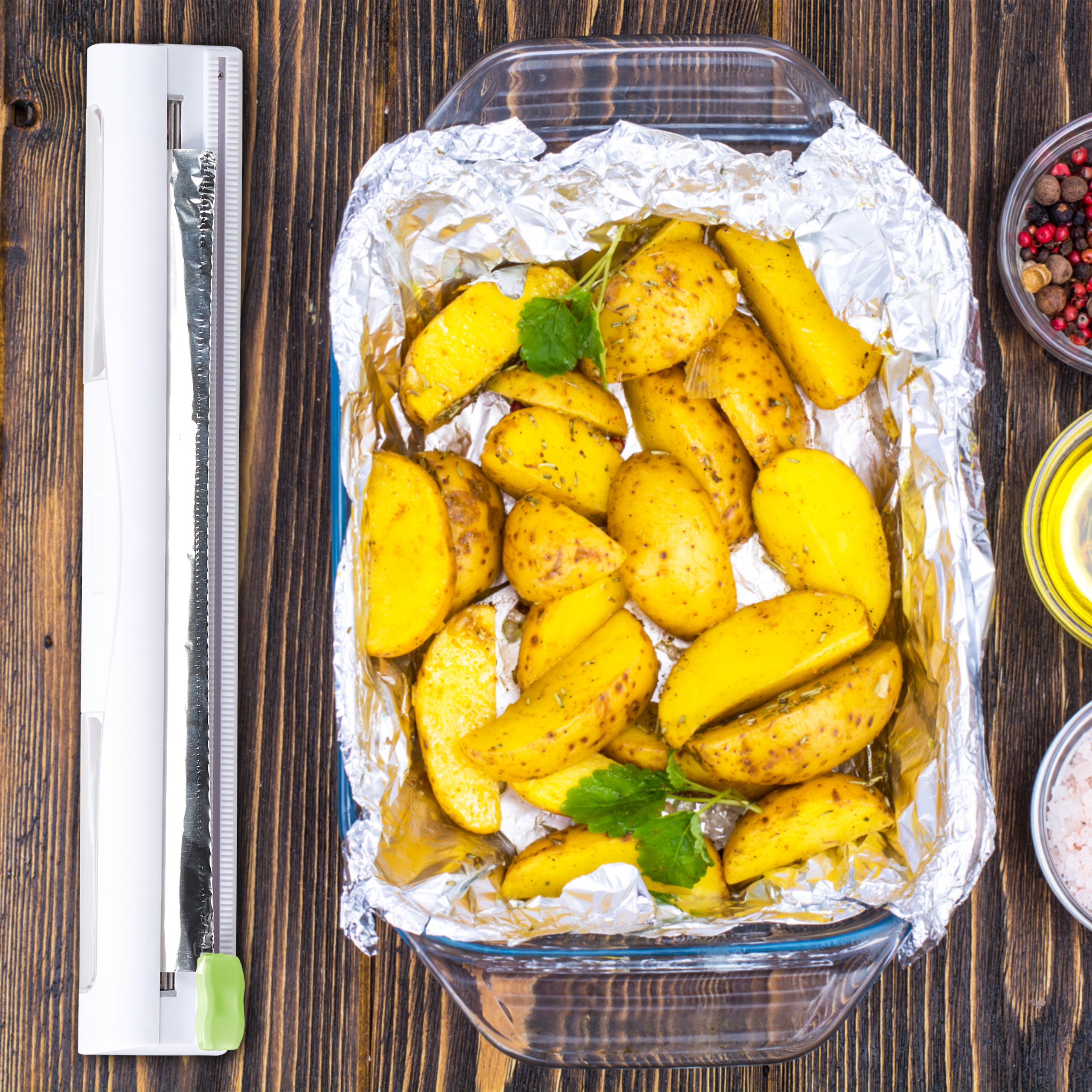 Įneškite tvarkos ir efektyvumo į savo virtuvę su šiuo išskirtiniu 4 maisto folijos pjaustytuvų rinkiniu. Šie elegantiški ir funkcionalūs įrankiai yra sukurti tam, kad jūsų kasdienė maisto ruošimo rutina taptų lengvesnė ir malonesnė.