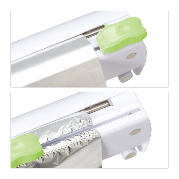 - Lengvas valdymas: Įdėkite aliuminio arba maistinę plėvelę į pjaustytuvą, ištraukite norimo ilgio ir perkelkite slankiklį į kitą pusę. Plėvelė bus atskirta švariai ir sklandžiai.