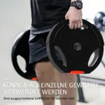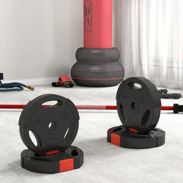 - ✔ Yra dvi 7,5 kg ir dvi 5 kg svorio lėkštės įvairioms treniruotėms
