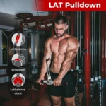 - Komplektas suteikia galimybę atlikti įvairius pratimus, tokius kaip tricepso tiesimas, platų ištraukimas, sėdimos eilės ir dvigalvių garbanos.