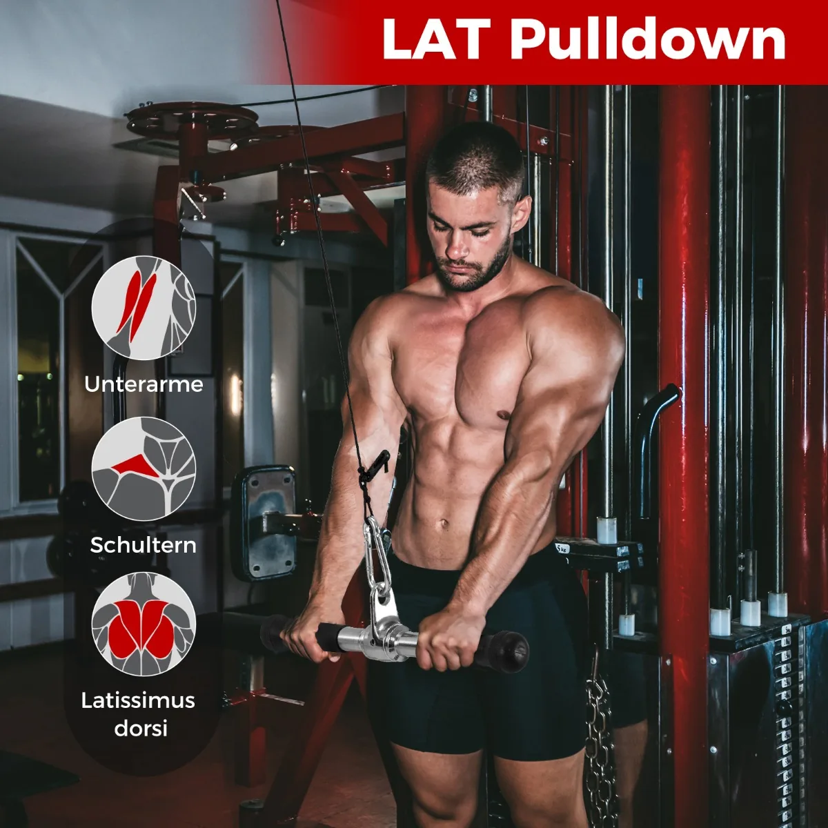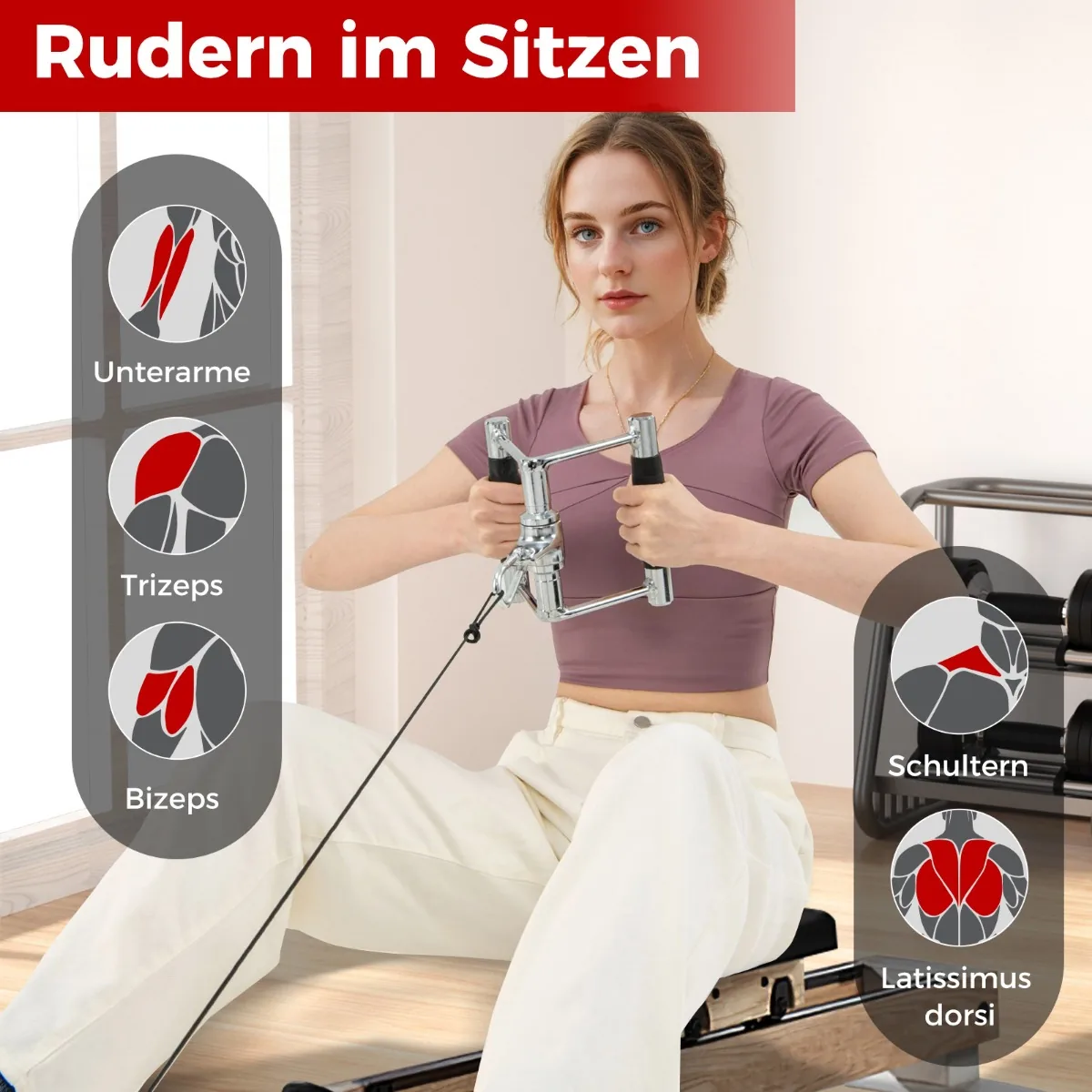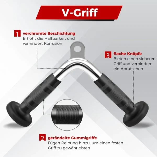 - V formos rankena, dviguba D rankena, tiesi sukimo juosta ir tricepso virvė viename rinkinyje.