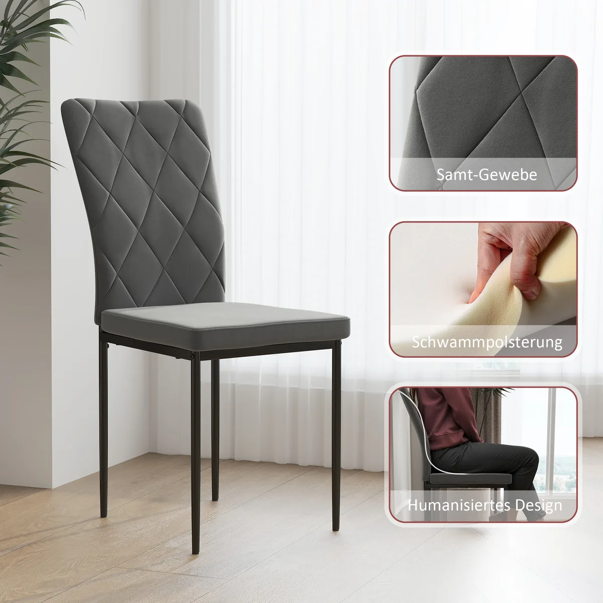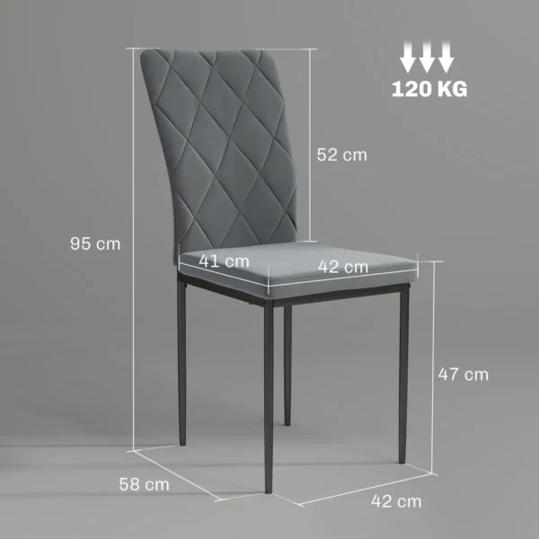 Šis keturių modernių HOMCOM valgomojo kėdžių rinkinys praturtins kiekvieną patiekalą. Aukšti atlošai su elegantišku deimantiniu raštu patraukia visų dėmesį, o aksominis, minkštas audinys ir ergonomiškos formos atlošas užtikrina komfortą. Šiose virtuvės kėdėse dera stilius ir praktiškumas, leidžiantis praleisti malonias valandas prie valgomojo stalo.