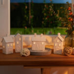 - Unikalus dizainas: Kiekviena žvakidė yra namelio formos su keliais langais, pro kuriuos švelniai prasiskverbia žvakių šviesa, sukurdama jaukią atmosferą.