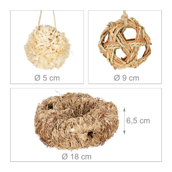 - 3 maži rutuliukai, kurie gali būti naudojami kaip dekoracija arba pakabinami narve žaidimui.