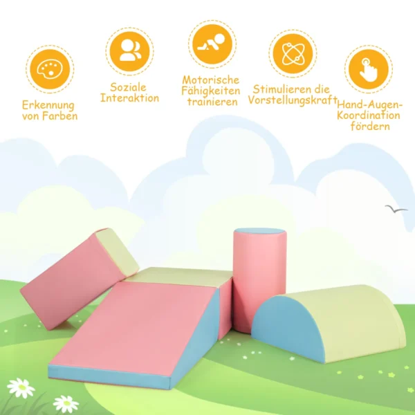 Rinkinys iš 5 statybinių kaladėlių įvairių spalvų skirtas vaikų motorinių įgūdžių ir koordinacijos lavinimui. Šios lengvos ir minkštos kaladėlės suteikia galimybę vaikams saugiai žaisti, laipioti bei kurti įvairias formas, ugdant vaizduotę.