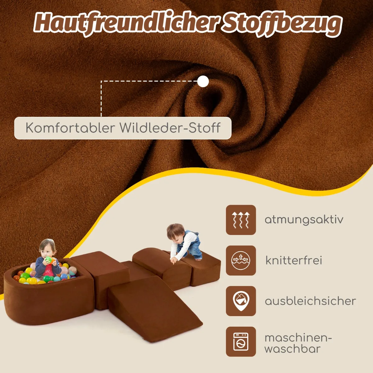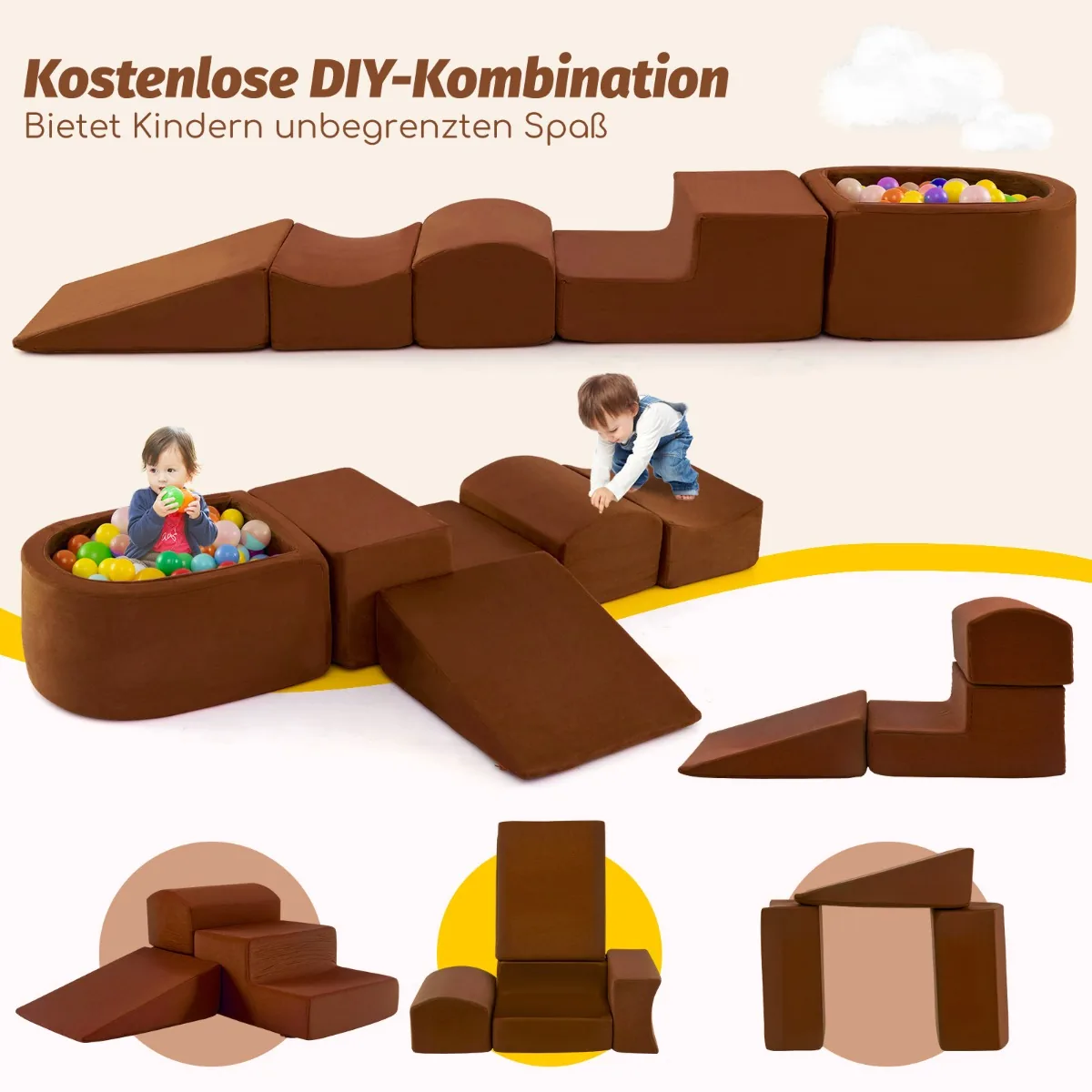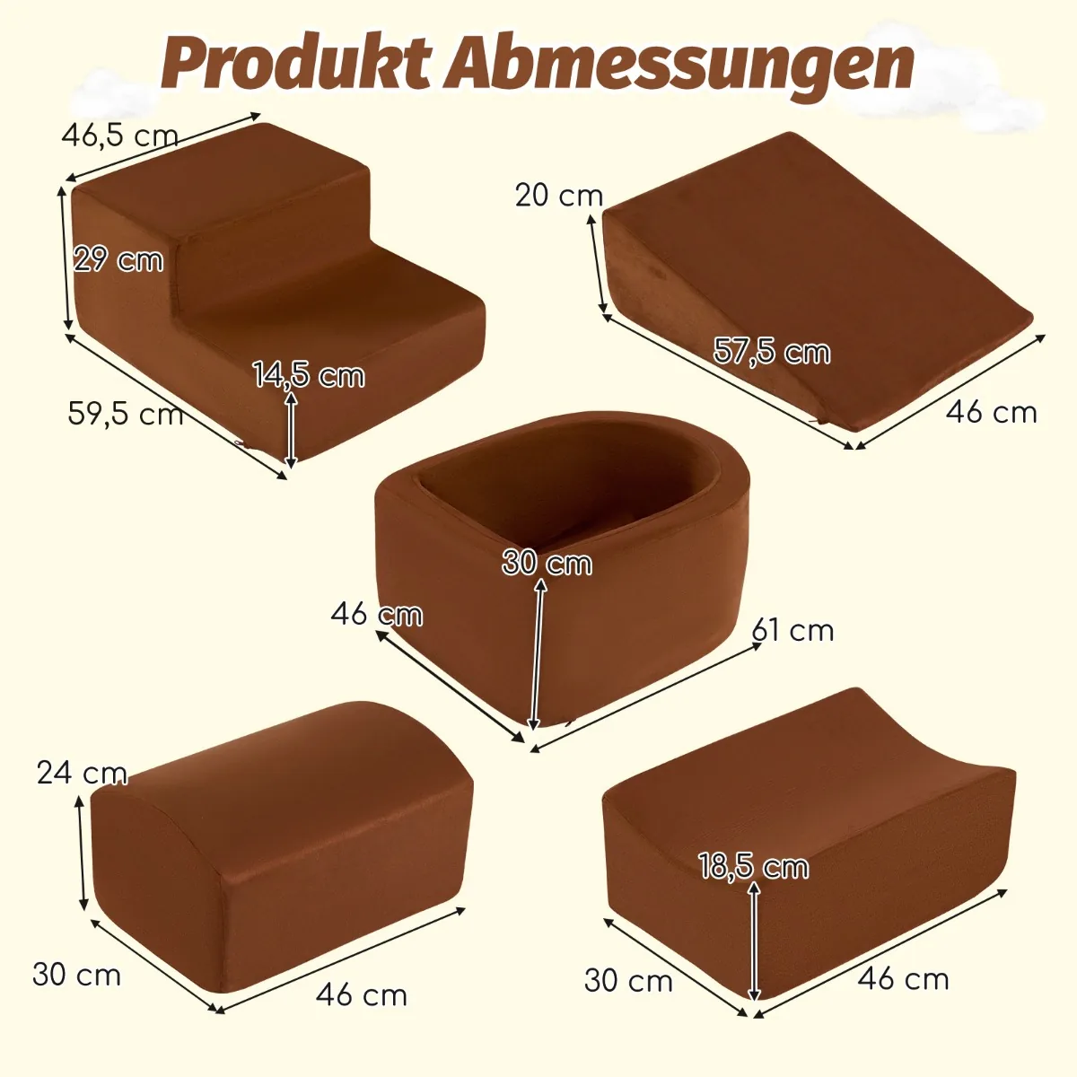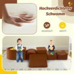 Rinkinys iš 5 statybinių kaladėlių rudos spalvos skirtas vaikų laipiojimo ir žaidimų veiklai. Šis minkštas kaladėlių komplektas tinka vaikams nuo 3 metų, skatinantį kūrybiškumą ir motorinių įgūdžių vystymą. Komplektą sudaro įvairios formos elementai, kuriuos galima laisvai derinti kuriant skirtingas struktūras.