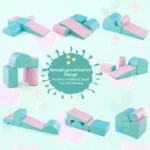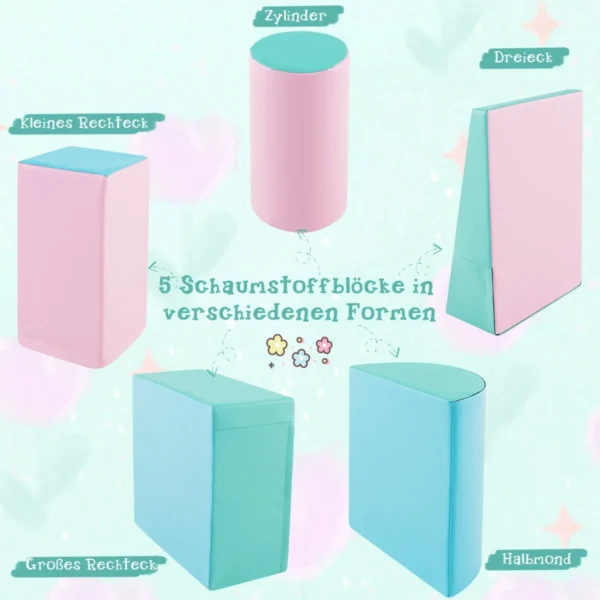 Rinkinys iš 5 statybinių kaladėlių žalios ir rožinės spalvos skirtas vaikų žaidimams ir motorinių įgūdžių lavinimui. Šie putplasčio blokai yra saugūs, lengvi ir lengvai valomi, todėl puikiai tinka namų, darželių ar ikimokyklinio ugdymo įstaigų aplinkoms.
