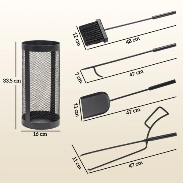 - ✔ Penkių dalių židinio priedų rinkinį sudaro šluota, kastuvas, žnyplės, pokeris ir krepšelis