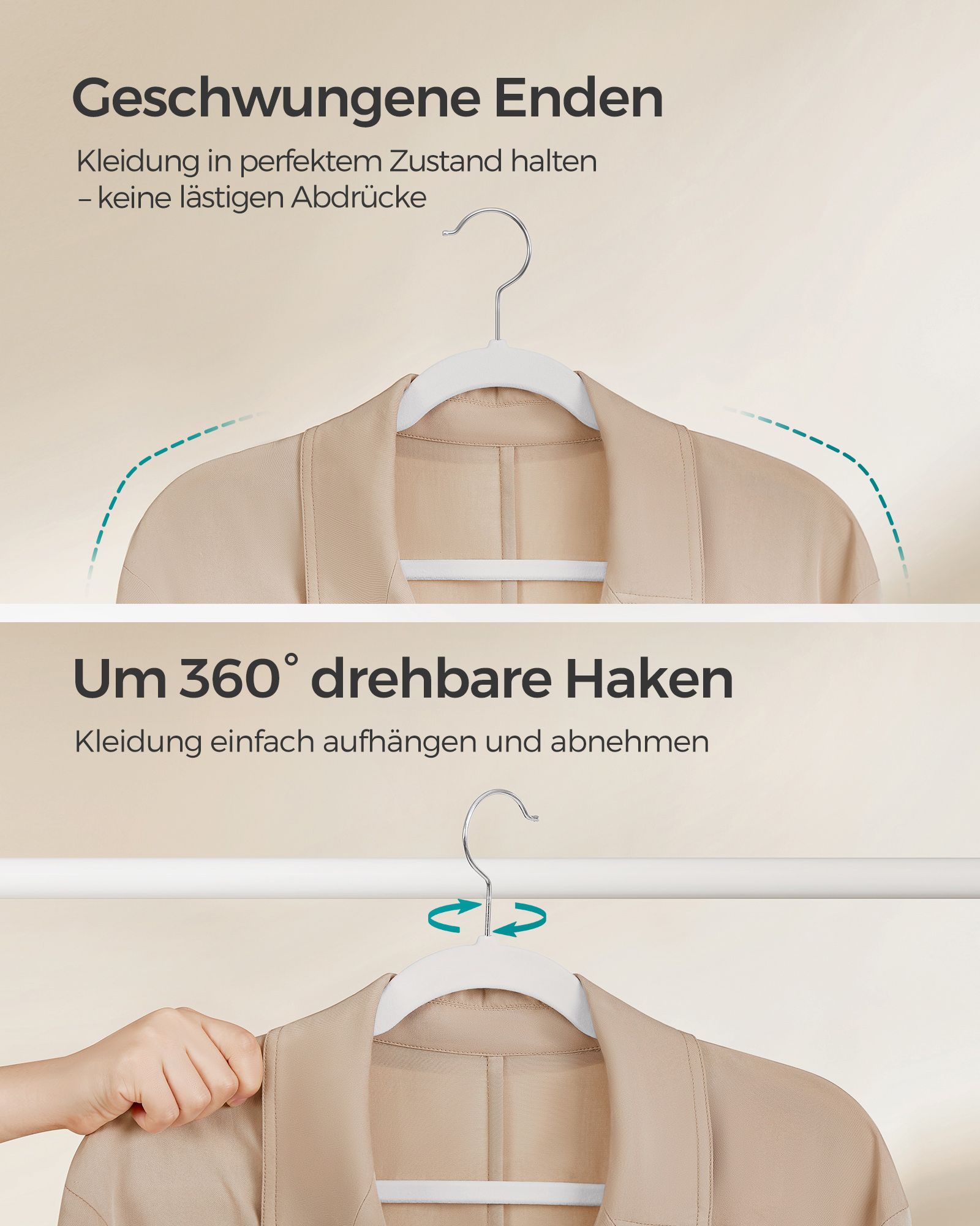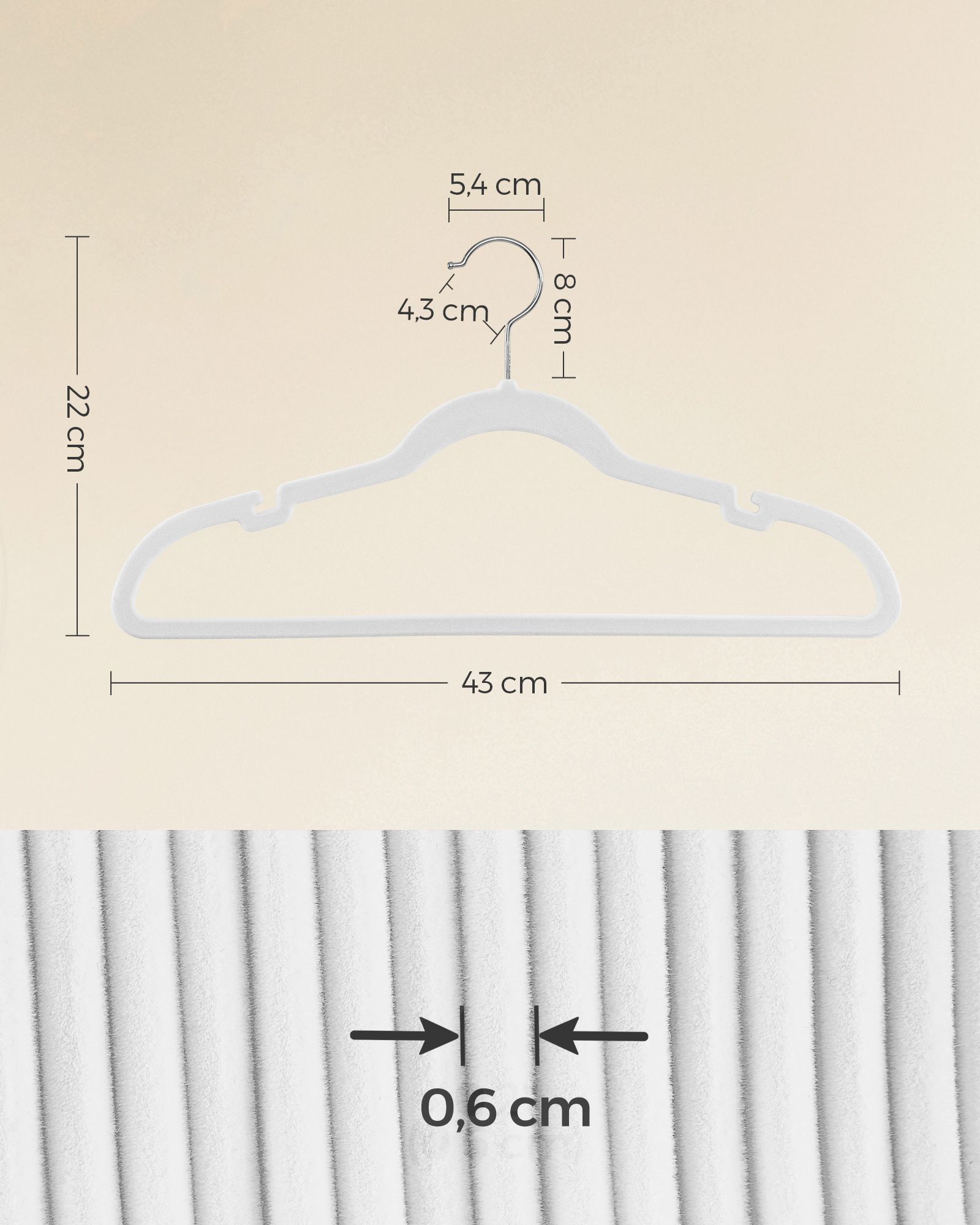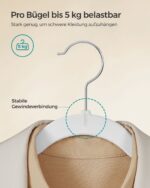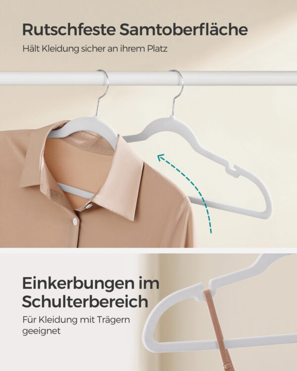 Šis rinkinys iš 50 baltų drabužių pakabų yra puikus pasirinkimas jūsų drabužių spintai. Pagamintos iš aksomo, ABS plastiko ir metalinio kabliuko, šios pakabos užtikrina tvirtumą ir ilgaamžiškumą.