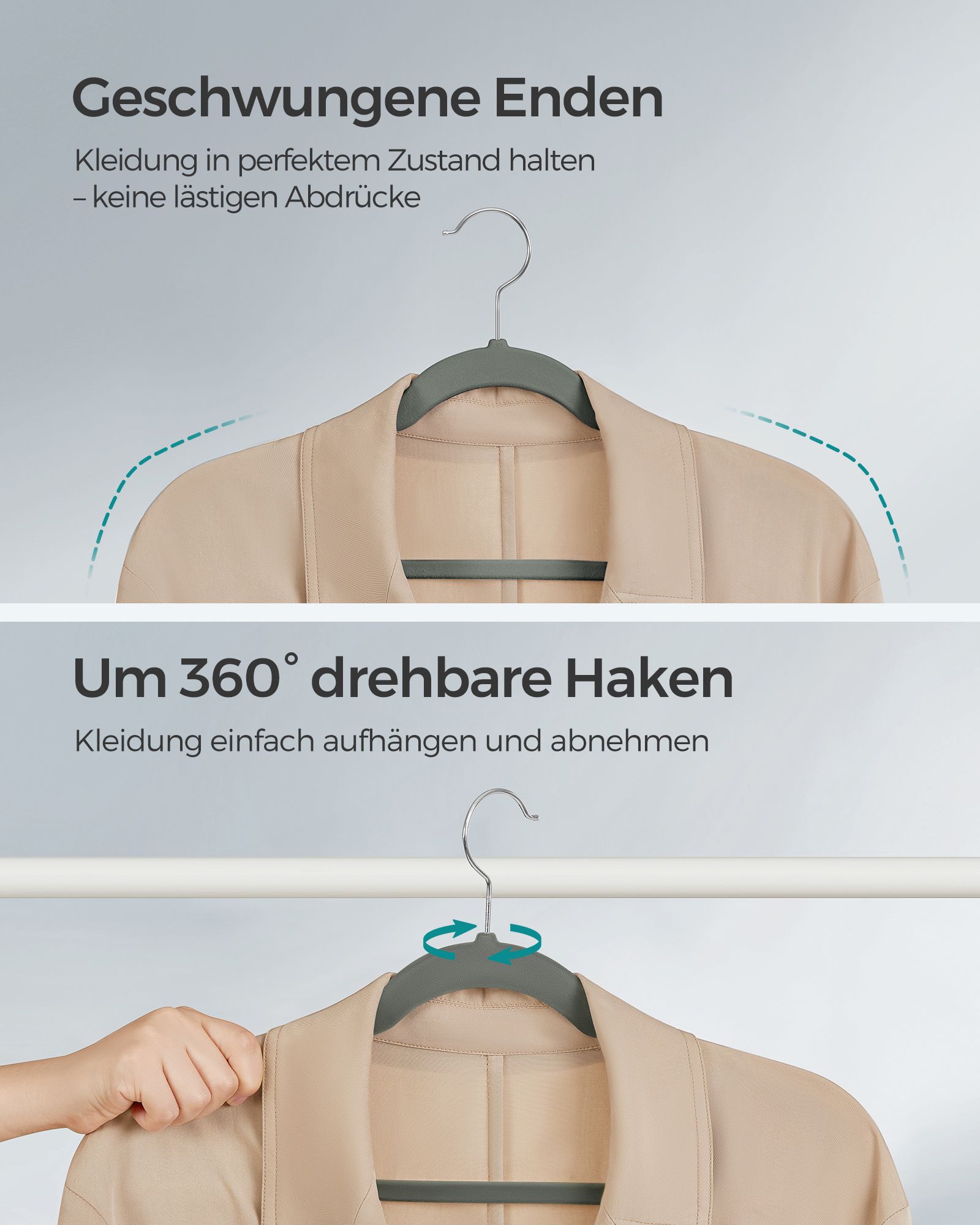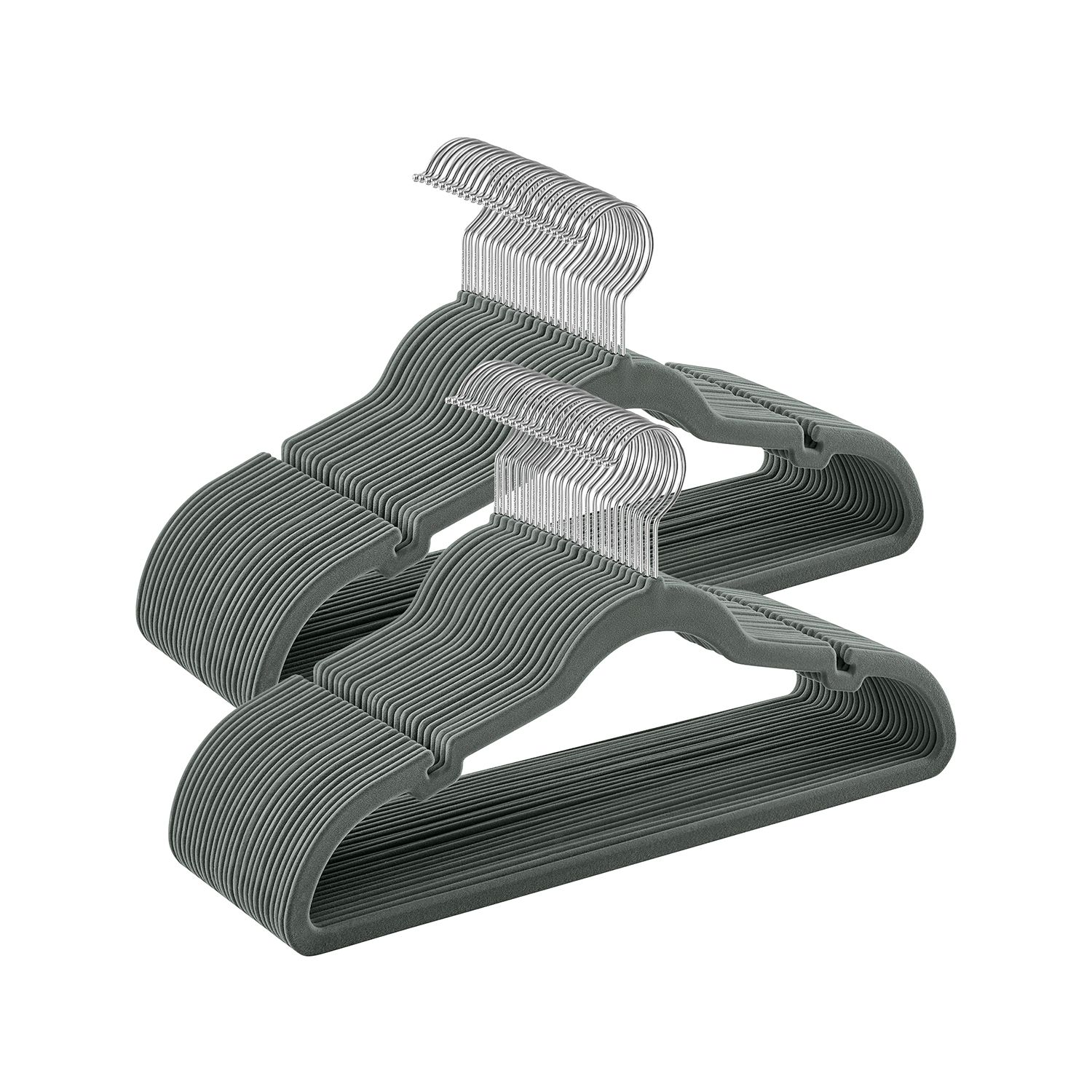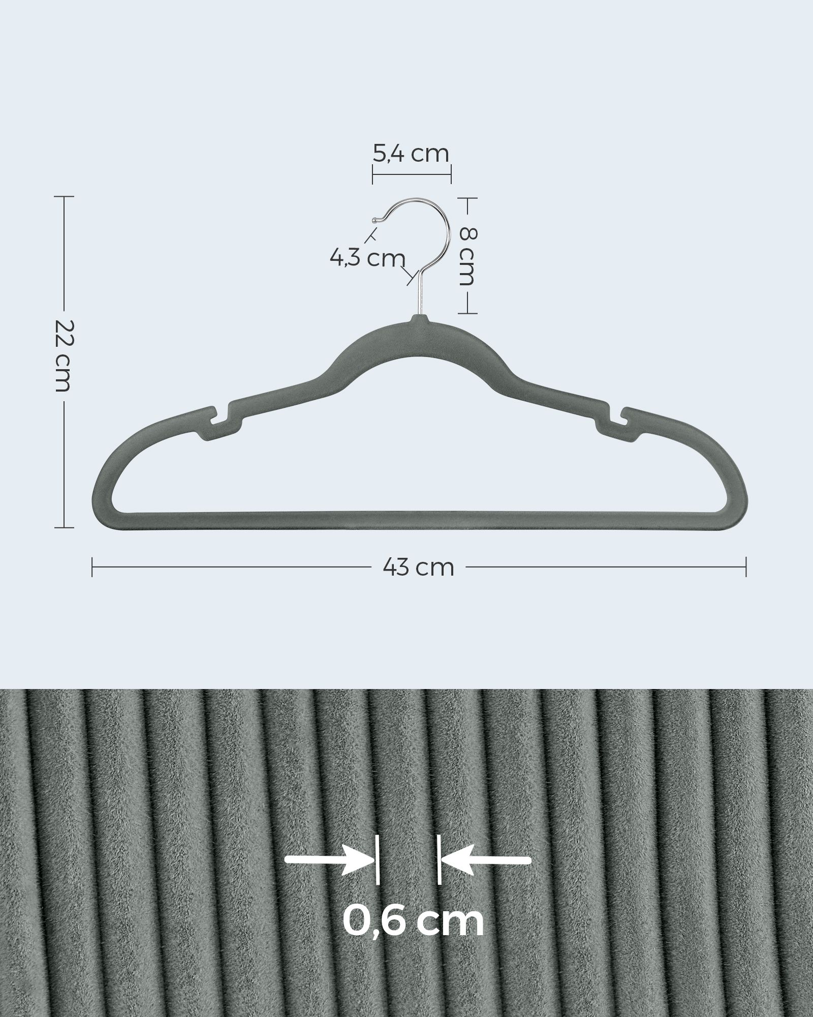 Šis rinkinys iš 50 pilkos spalvos drabužių pakabų yra puikus pasirinkimas jūsų drabužių organizavimui. Aksominė danga ne tik suteikia elegancijos, bet ir apsaugo drabužius nuo slydimo.