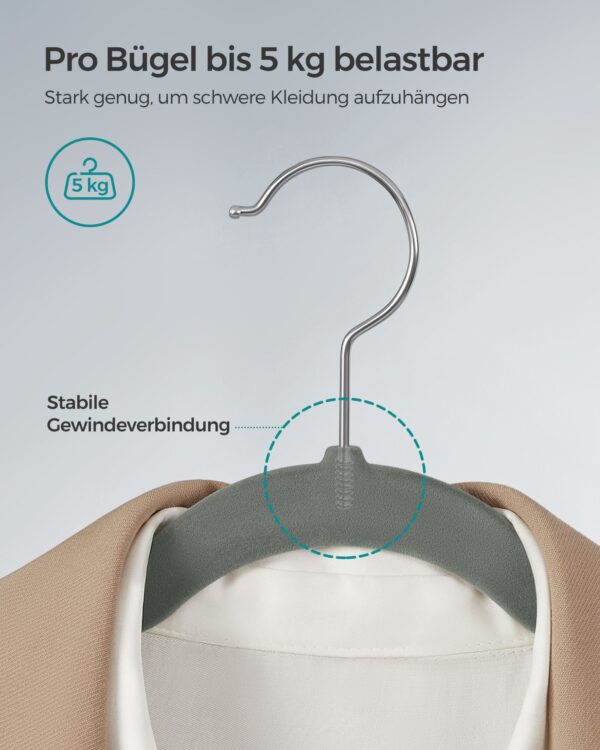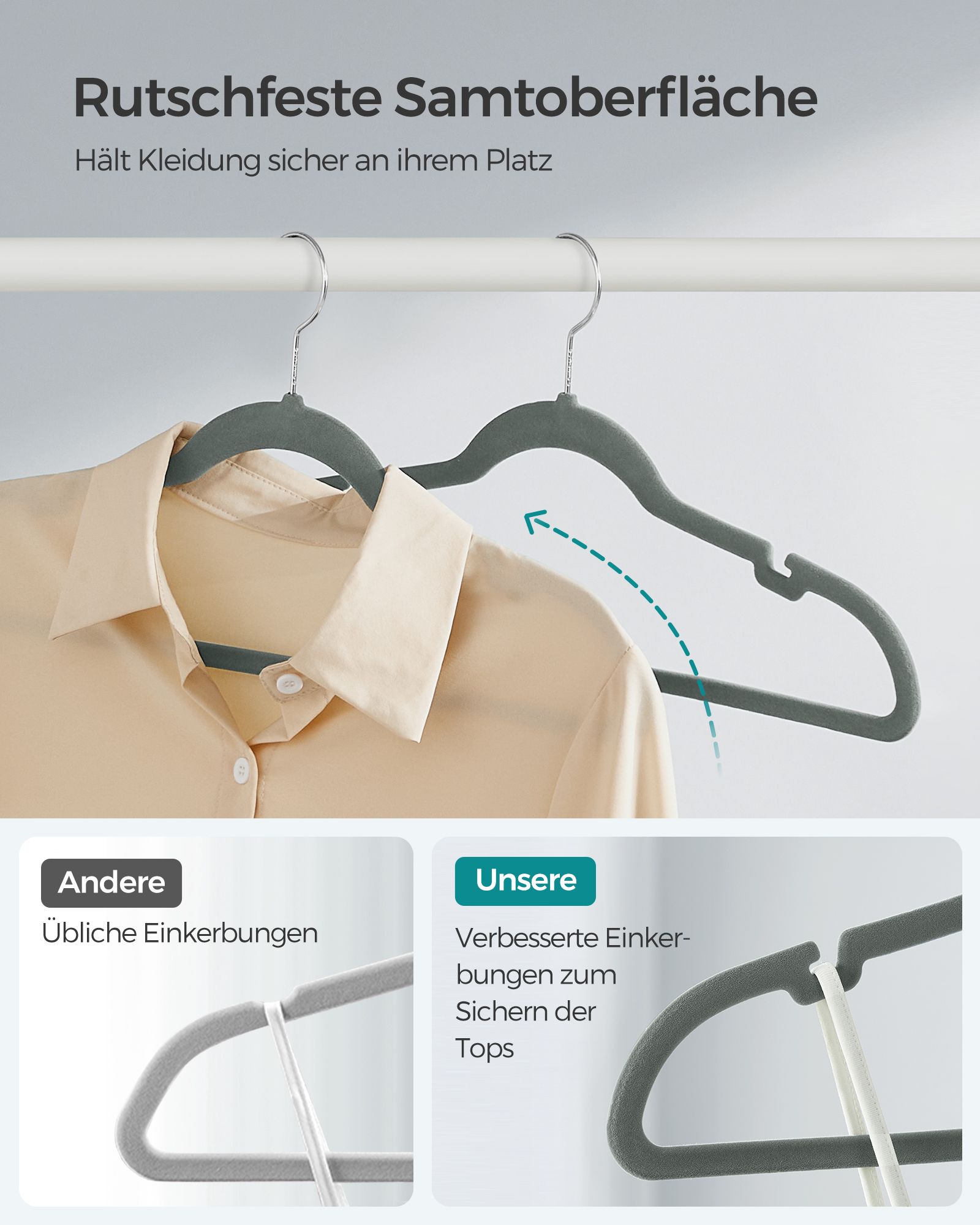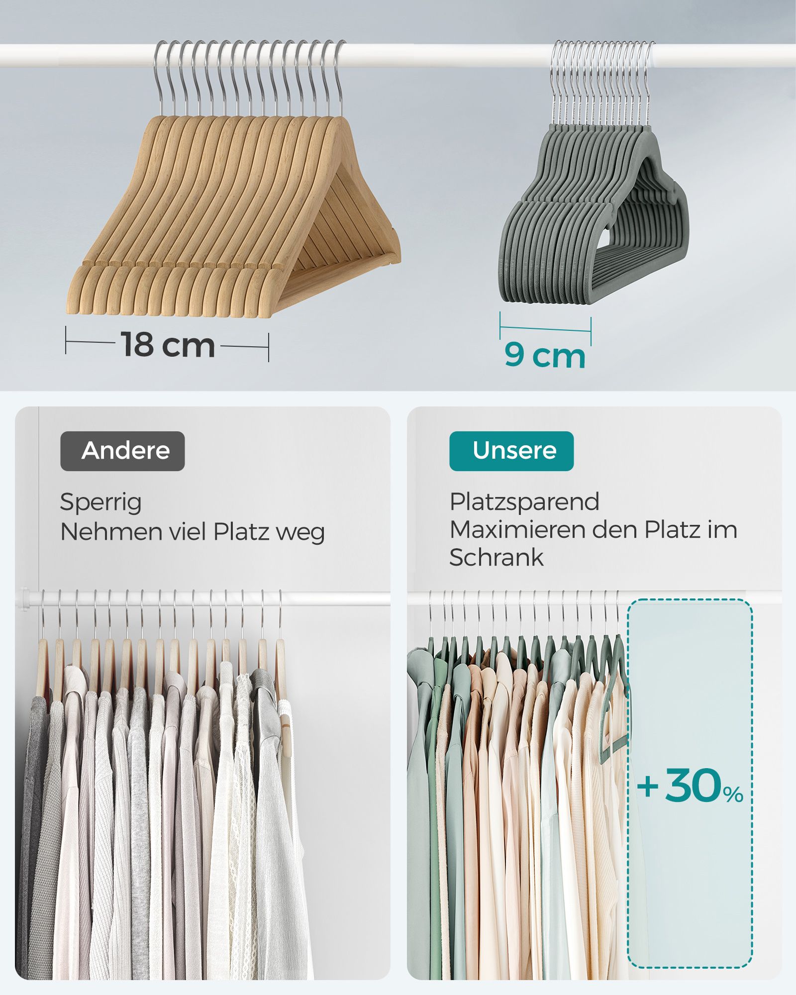 Šis rinkinys iš 50 pilkos spalvos drabužių pakabų yra puikus pasirinkimas jūsų drabužių organizavimui. Aksominė danga ne tik suteikia elegancijos, bet ir apsaugo drabužius nuo slydimo.