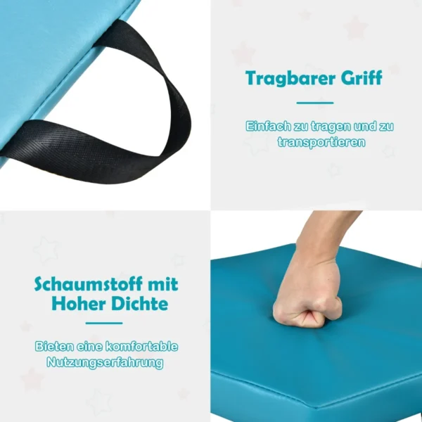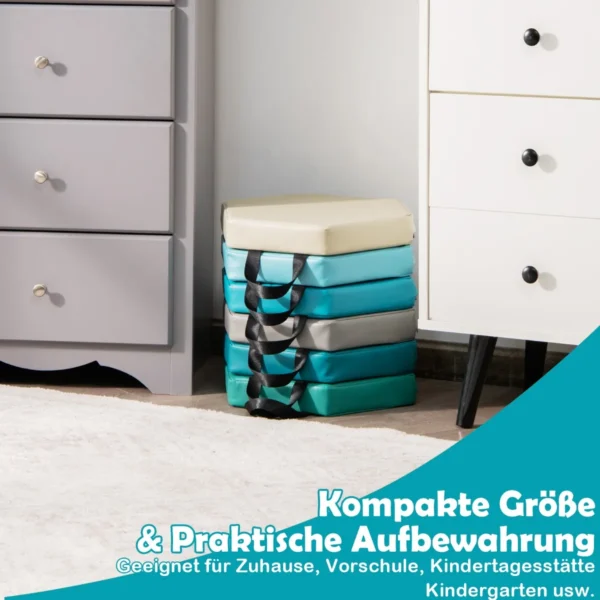 Rinkinys iš 6 sėdmaišių 38x34x5 cm mėlynos ir pilkos spalvos puikiai tinka vaikams žaisti, mokytis ir ilsėtis. Šios grindų pagalvėlės skatina spalvų atpažinimą bei kūrybiškumą, jas lengva transportuoti ir laikyti.