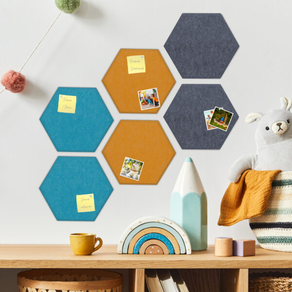 Pristatome jums elegantišką ir funkcionalų sprendimą jūsų erdvei – rinkinį iš 6 šešiakampių skelbimų lentų, kurių matmenys yra 26x30x0,9 cm. Šios lentos yra puikus būdas sujungti estetiką ir praktiškumą, suteikiant jūsų interjerui unikalų akcentą. Pasirinkite iš mėlynos, geltonos ir pilkos spalvų derinio, kuris puikiai derės prie bet kokio interjero.