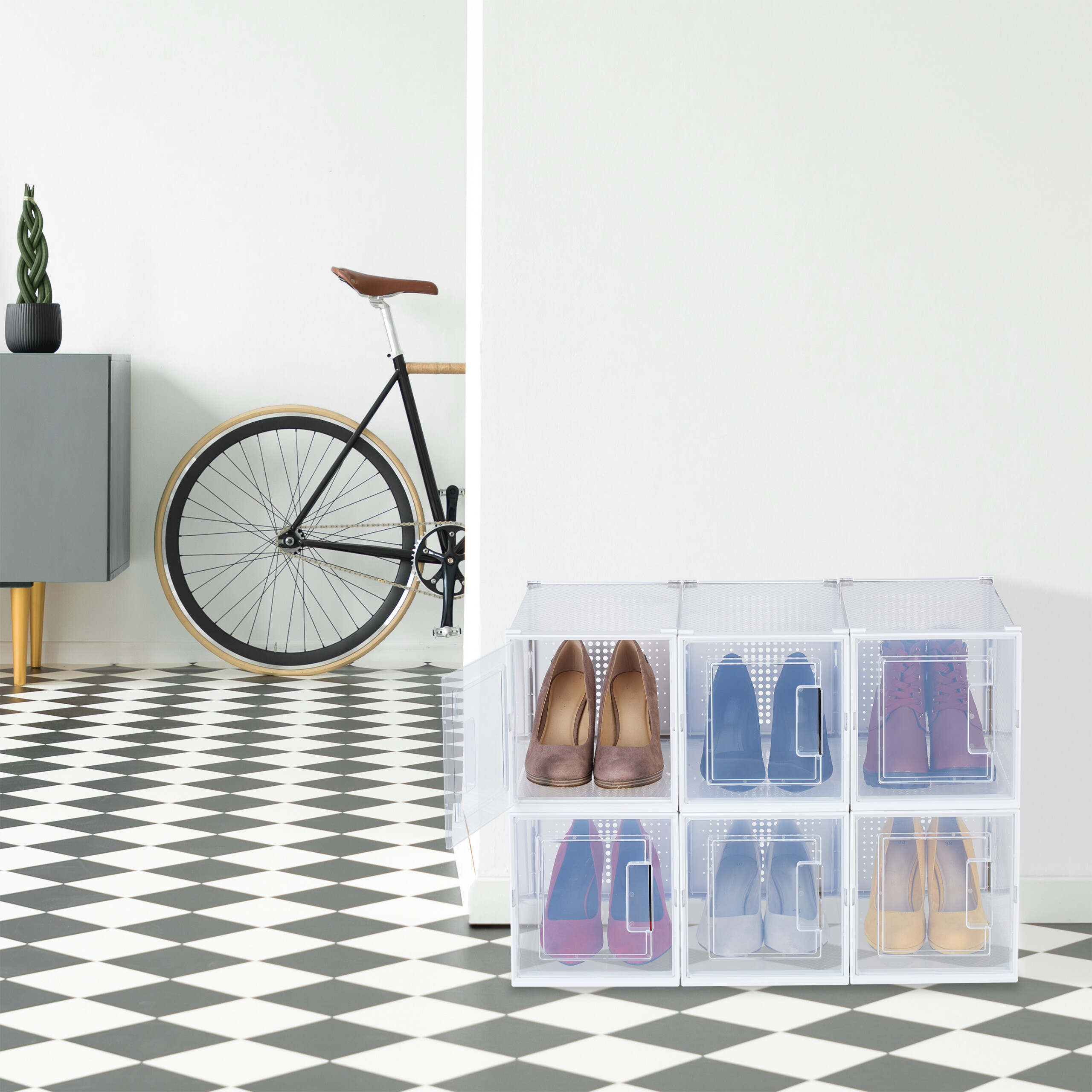 Organizuokite savo batų kolekciją su elegancija ir praktiškumu! Mūsų rinkinys iš 6 skaidrių dėžių yra puikus sprendimas tiems, kurie nori išlaikyti savo aukštakulnius tvarkingai ir lengvai pasiekiamus. Šios dėžės ne tik suteikia tvarką, bet ir leidžia greitai rasti mėgstamus batus, nes jų permatomas dizainas užtikrina aiškų vaizdą.