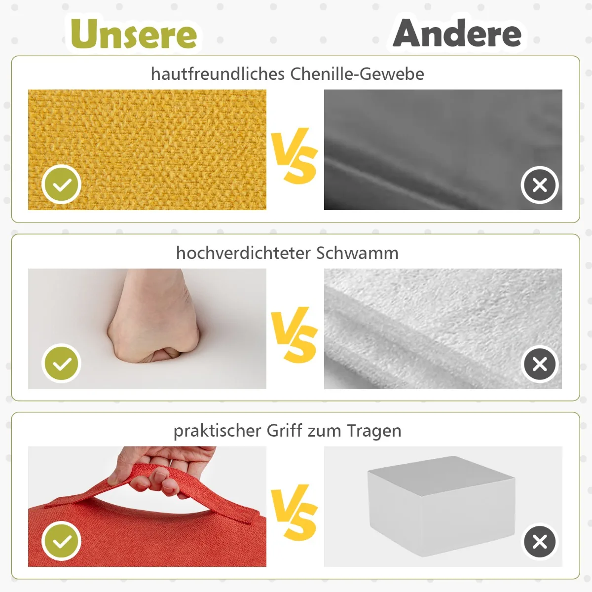 - Blokeliai padengti neslystančiu, minkštu šeniliniu audiniu, kuris yra lengvai valomas ir skalbiamas mašinoje.