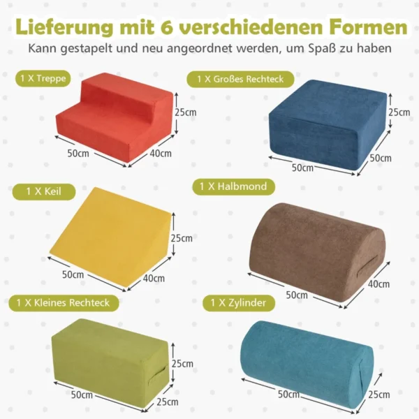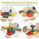 Rinkinys iš 6 statybinių blokelių, įvairių spalvų, skirta vaikų laipiojimo ir ropojimo žaidimams. Blokeliai yra pagaminti iš didelio tankio putplasčio ir išorėje padengti minkštu, odai nekenksmingu šeniliniu audiniu, kuris užtikrina saugią ir patrauklią žaidimų terpę mažiesiems.